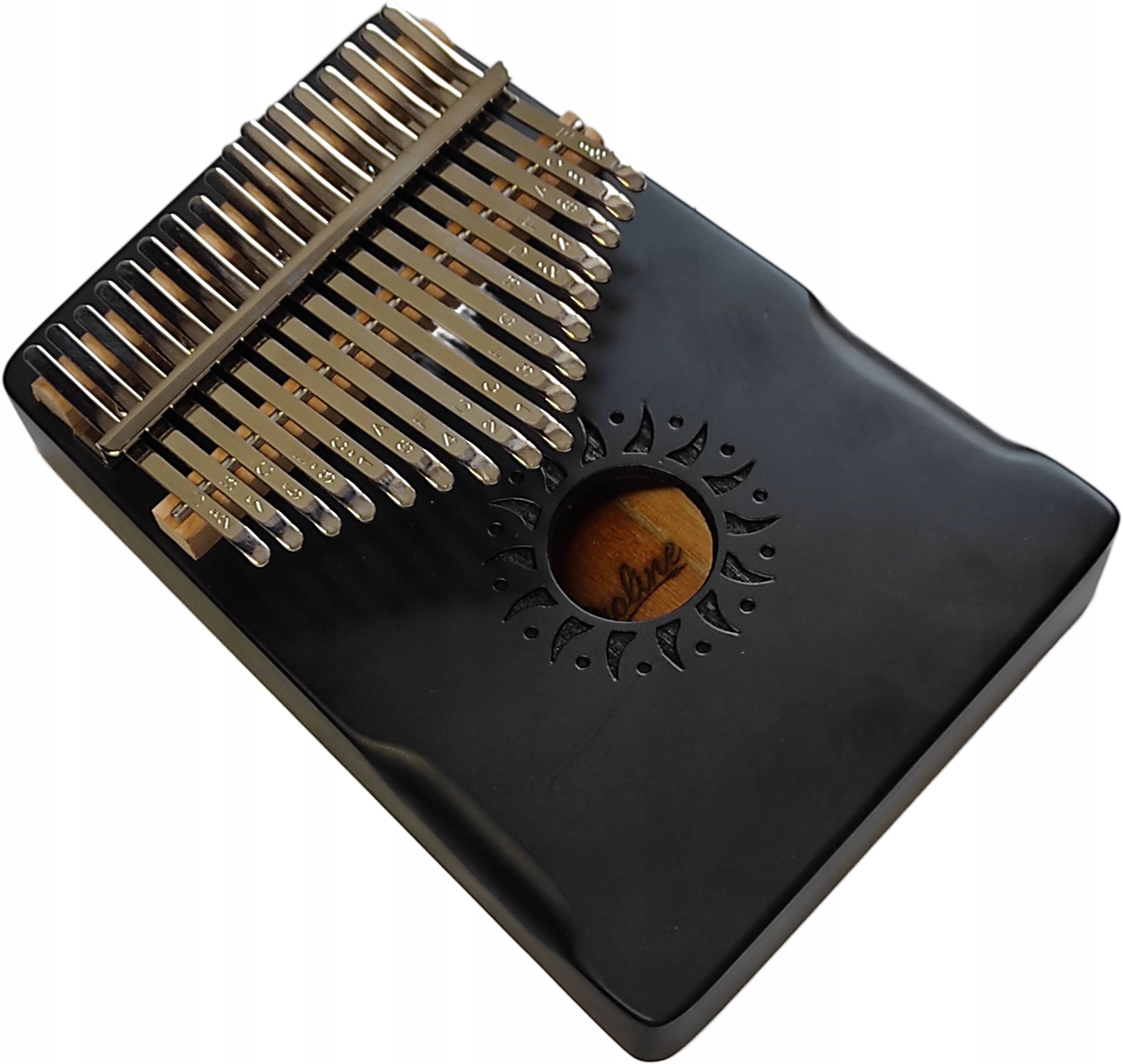 Калимба с корпусом из красного дерева и 17 тонами эффектной матовой черной отделки. В комплект также входят тюнинговый молоток, ткань, наперстки, набор наклеек и текстильный чехол. Размеры инструмента 13 х 18 х 3 см. Диаметр звукового отверстия 3,5 см. Вес самой калимбы 0,28 кг.