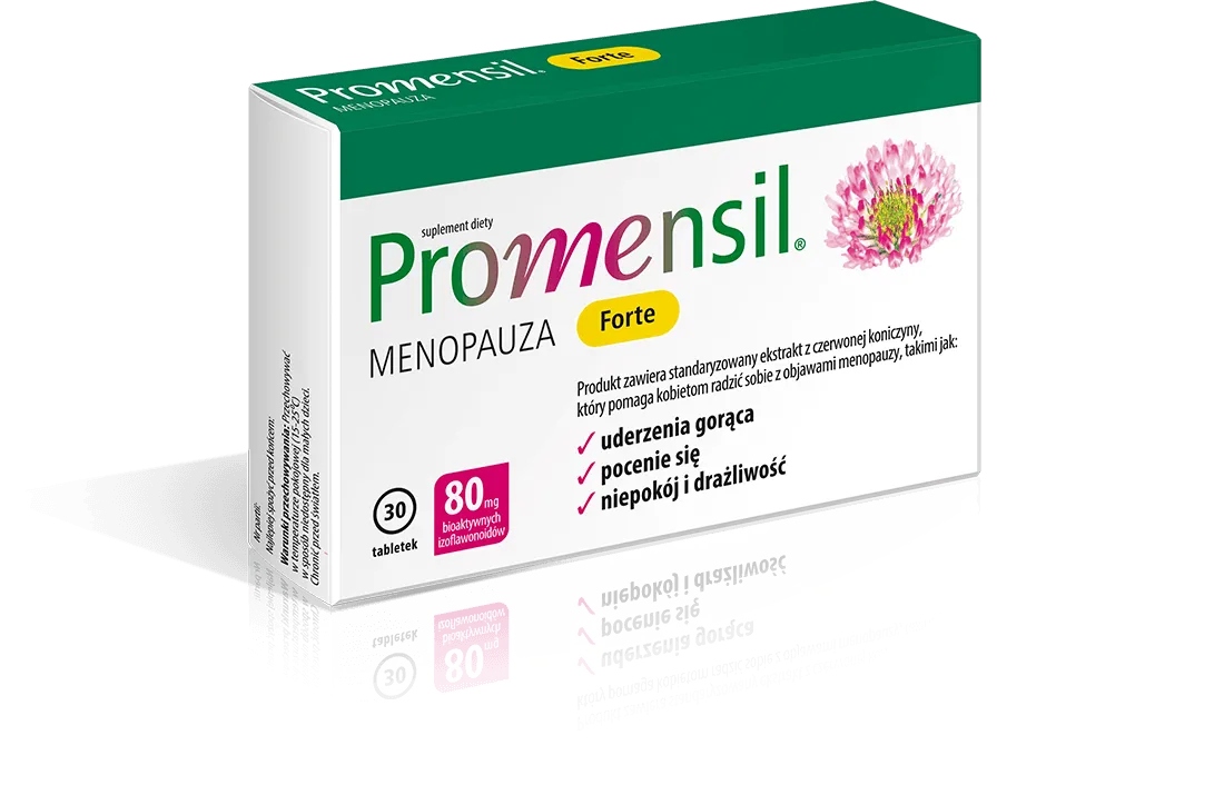 1 планшет содержит: Стандартизированный экстракт красного клевера 200 мг, включая биологически активные 80 мг изофлавоноидов. экстракт (трифолиум пратенса), содержащий изофлавоноиды (дидзеина, генистеин, биочан и формононетин); Заполнительское вещество: фосфаты кальция, микрокристаллическая целлюлоза; Оболочка таблеток (утолщающее вещество: гидроксипропилометилцеллюлоза, красители: оксиды железа и гидроксид, полиэтиленгликоль); Анти -ксферические вещества: диоксид кремния, соли магния жирных кислот; Эмульгатор: карбоксиметилцеллюлоза натриевая соль, антиоксидант: альфа-токоферол. Рекомендуется использовать 1 планшет в течение дня. Таблетку следует проглотить и пить воду. Если вы пропустите ежедневную часть, вам следует возобновить принятие продукта на следующий день - без необходимости дополнить пропущенным планшетом. Первые эффекты использования ощущаются после 3-6 недель получения Promensil Forte. Чтобы поддерживать полезный эффект, вы должны поддерживать использование подготовки. Рекомендуется длительное использование. Диетическая добавка не может быть использована в качестве заменителя (замены) разнообразной диеты. Для поддержания надлежащего здоровья следует использовать разнообразную диету и здоровый образ жизни. В случае гиперчувствительности к любому компоненту продукта его не следует использовать