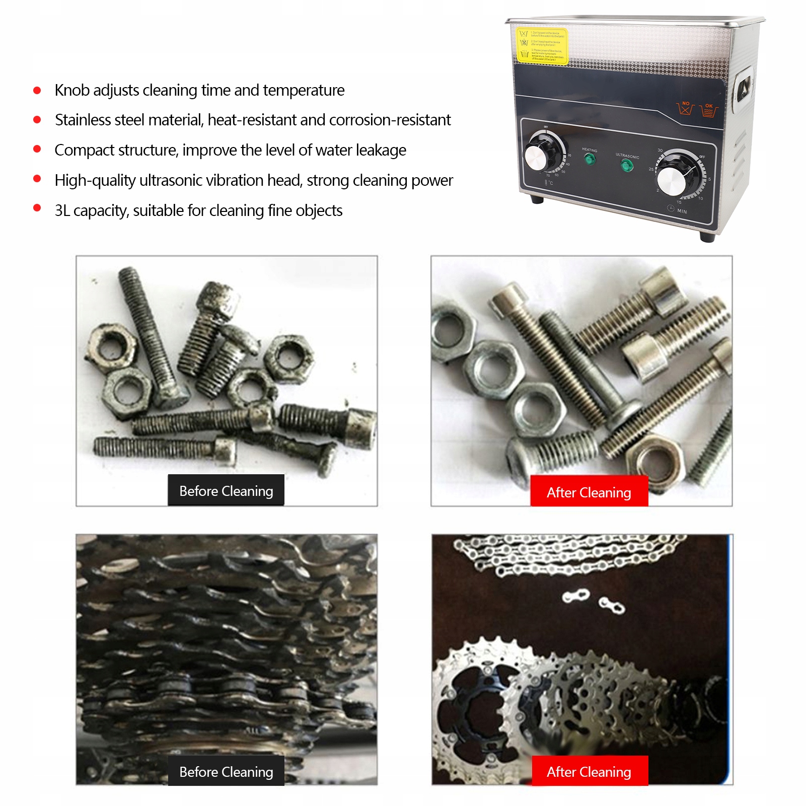 - Подходящие чистящие средства: электроника, лабораторные принадлежности, канцелярские товары, предметы домашнего обихода, материнские платы и аксессуары для компьютеров, стеклянная посуда, печатные платы, автомобильные детали, детали аппаратного обеспечения, медицинское оборудование, зубные протезы и стоматология. оборудование, очки, ожерелья, серьги, браслеты, часы, чернильные головки для принтеров (специальная чистящая жидкость не требуется, достаточно водопроводной воды), перья, значки, соски, чашки, средства для чистки фруктов, овощей и т. д.