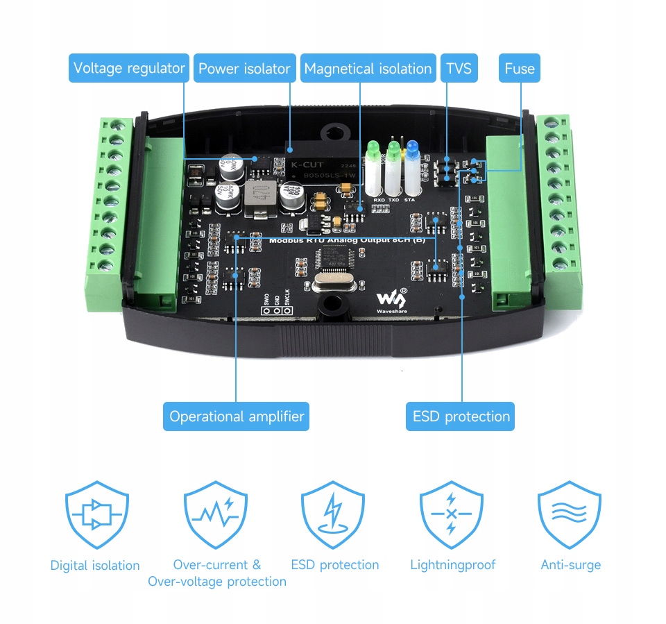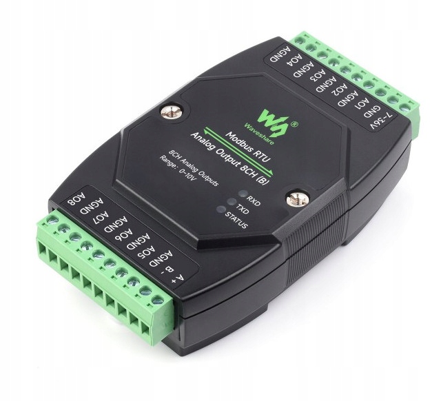 Промышленный 8-канальный модуль аналогового вывода, цифро-аналоговое преобразование в 12 бит, позволяет одновременно генерировать напряжение или ток на 8 каналах, широкий диапазон мощности постоянного тока источник от 7 до 36 В, использует протокол Modbus RTU, поддерживает монтаж на рейку.