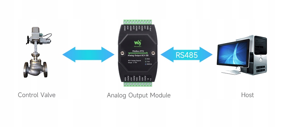 Modbus RTU Analog Output 8CH — это модуль аналогового вывода промышленного стандарта, поддерживающий одновременный вывод на 8 каналов. Он использует протокол Modbus RTU со встроенными схемами защиты, такими как изоляция питания, магнитная изоляция, самовосстанавливающийся предохранитель и TVS.