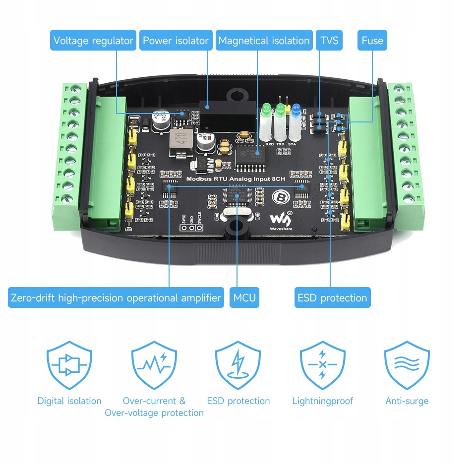 Модуль промышленного сбора аналоговый с 8 каналами, 12 бит, высокая точность, поддержка регистрации напряжения и тока, с широким диапазоном питания от 7 до 36 В постоянного тока и протоколом Modbus RTU.