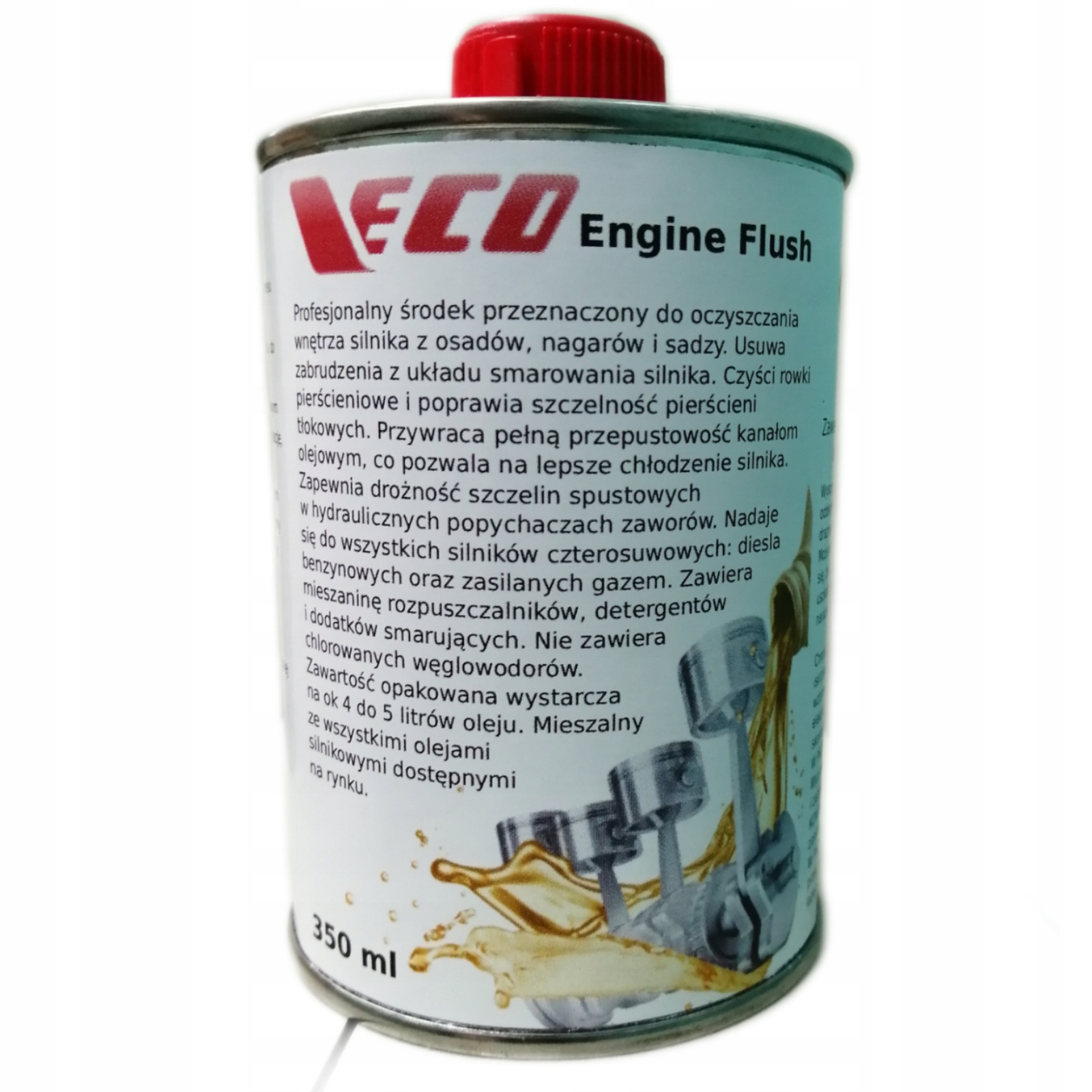 VECO Engine Flush – препарат, содержащий уникальный состав растворителей, эффективных моющих средств. и эффективные смазочные присадки. Не содержит хлорированных углеводородов. Содержимого упаковки хватает примерно на 4–5 литров масла.