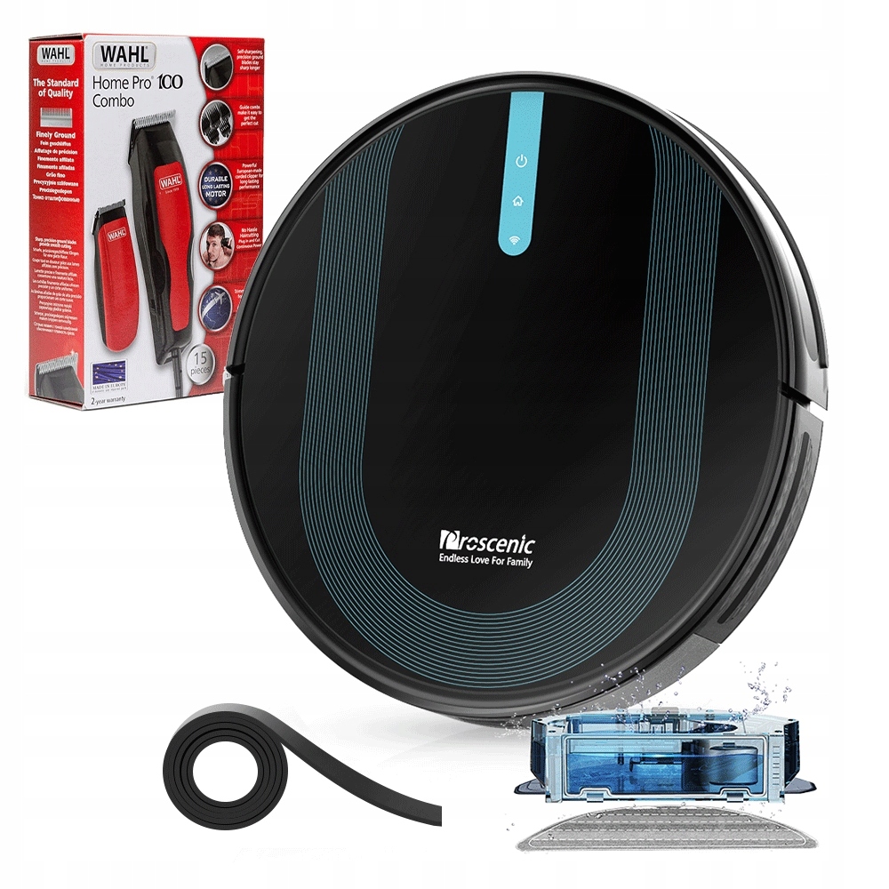 - Состав набора: робот, пылесборник, резервуар для воды с фильтром, мочалка со шваброй, пульт дистанционного управления, 4 боковые щетки, магнитная полоса, док-станция