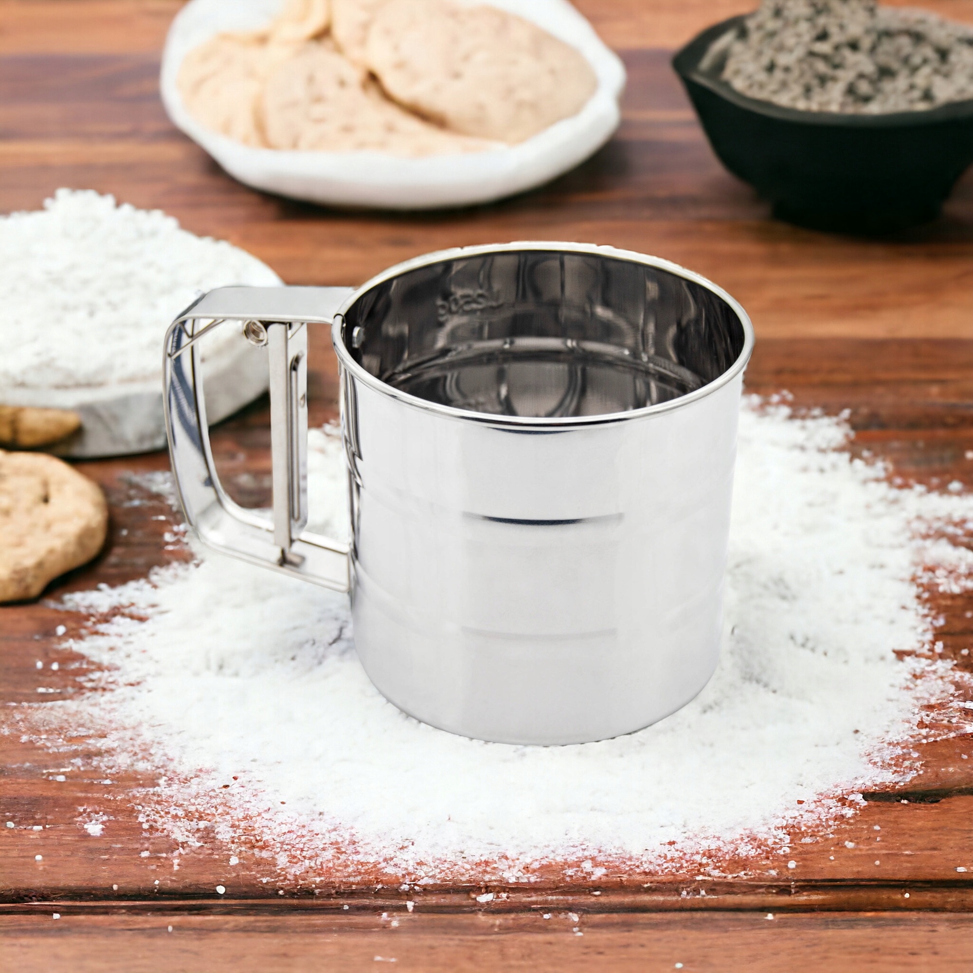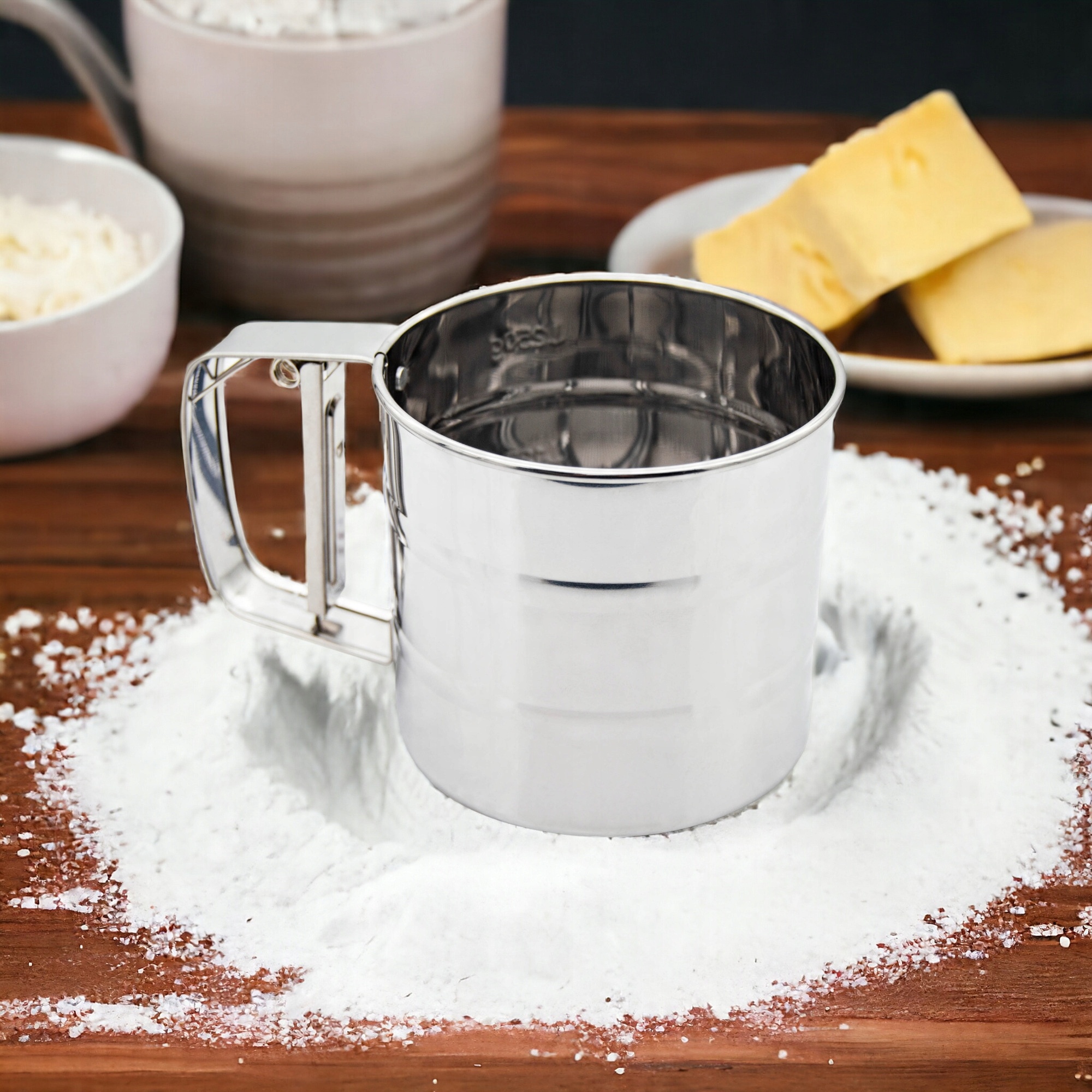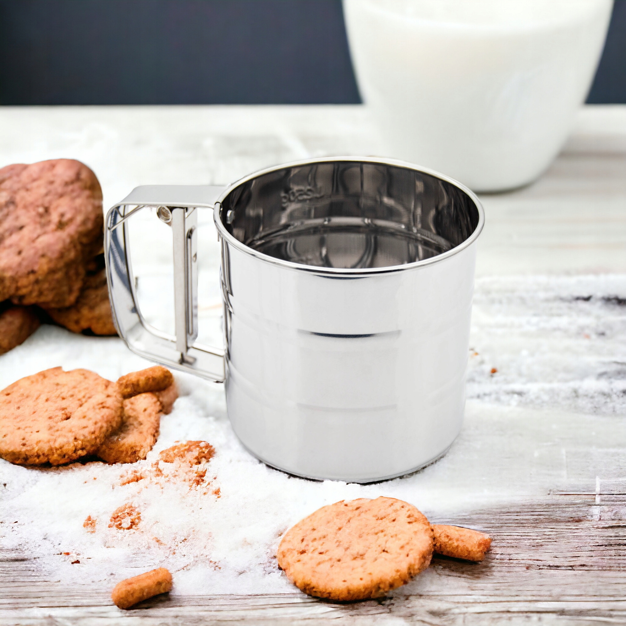 Сито для муки и других сыпучих продуктов изготовлено из стали высочайшего качества, а его отличная конструкция дает нам полное удовлетворение от использования. Предмет представляет собой не что иное, как контейнер, оснащенный специальными лопатками. Приводятся в движение механизмом, расположенным в ручке сита – они приводят муку в движение, а затем она просеивается через сито, расположенное в основании контейнера.