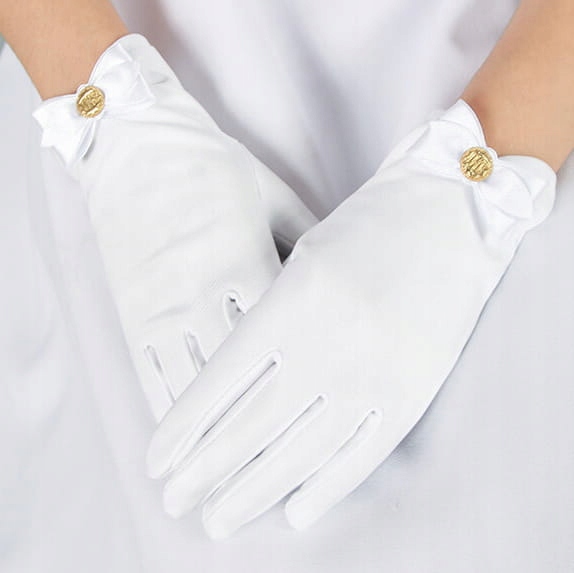 Перчатки для причастия пятипалые из гладкого и эластичного атласа. Украшен бантиком с золотой булавкой IHS. Благодаря своему элегантному внешнему виду они станут украшением любого платья или альбома.