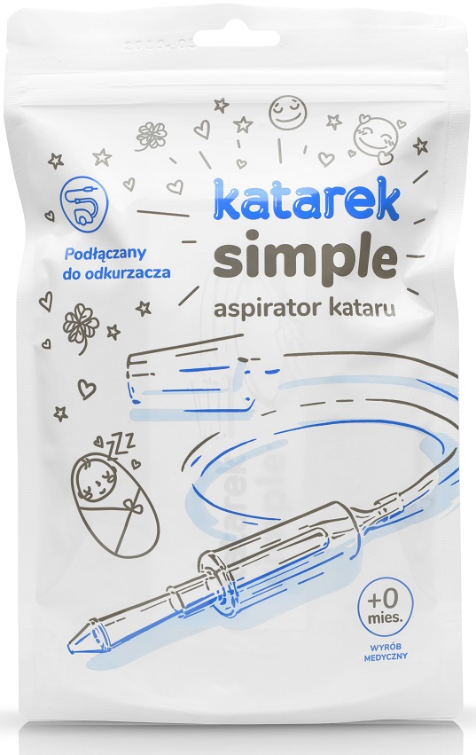 Katarek Simple to самая простая, базовая модель аспиратора, подключаемого к пылесосу. В упаковке находится аспиратор Катарек Стандарт. Имеет единую несъемную камеру с резервуаром для секрета и редуктором силы всасывания пылесоса. В комплект поставки устройства входят две сменные насадки, надеваемые на нос ребенка.