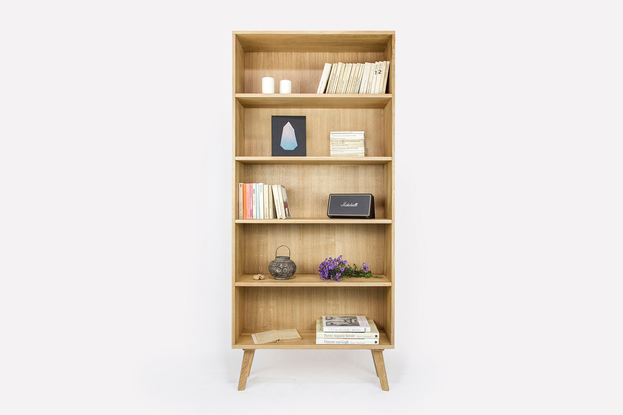 Книжный шкаф и многое другое, состоящее из пяти полок. Благодаря минималистичному дизайну его можно разместить практически где угодно, не занимая слишком много места. Полка изготовлена из древесины дуба, задняя стенка – из доски, покрытой дубовым шпоном.