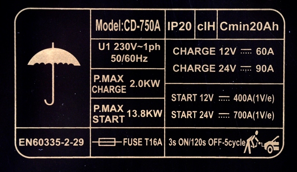 Класс 750 имеет таймер, который автоматически отключает устройство по истечении заданного времени, что предотвращает перезаряд аккумулятора во время быстрой зарядки. Идеально подходит для запуска транспортных средств с бензиновыми и дизельными двигателями, таких как грузовики, грузовые фургоны, сельскохозяйственные машины и т. д.
