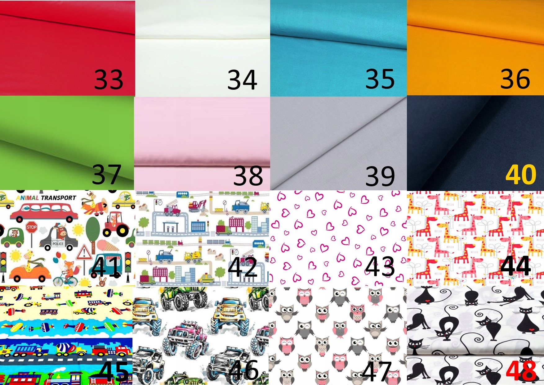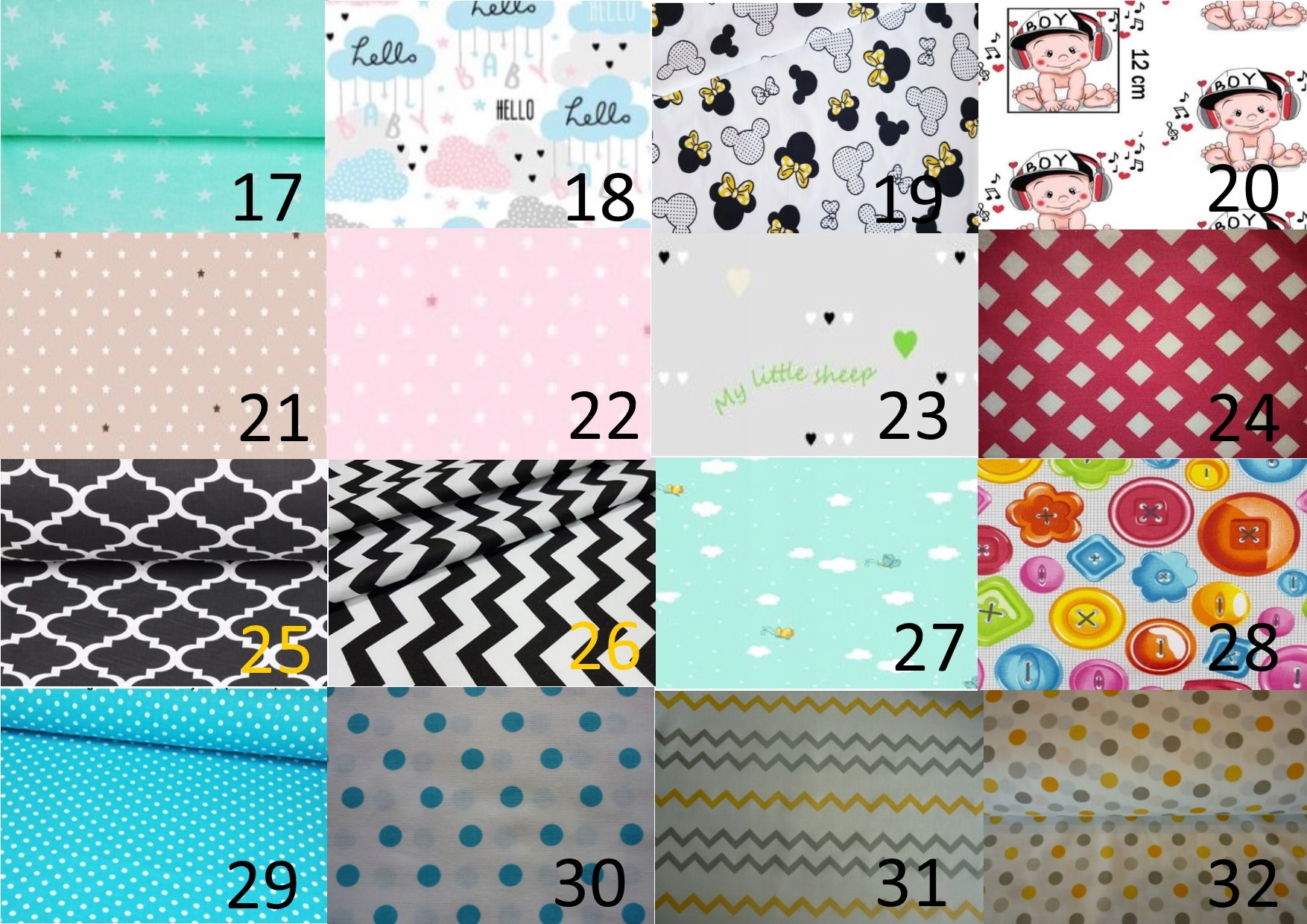 1.Белая точка на сером 2.Серая звезда на белом 3.Собаки и кошки 4. Серая точка на белом 5. Клевер на сером - нет 6. Белая звезда на сером 7. Серый сафьян 8. Серый зигзаг 9 .Серый мишка 10.Серо-черно-розовая звезда 11.Бабочки 12.Разноцветные шарики 13.Мишки Тедди 14.Машинки II 15.Машинки в полоску 16.Шарики на зеленом - нет 17. Звезда на мятном 18.Облака 19.Микки Маус 20.Малыш 21.Рождество на лососевом - нет 22.Рождество на розовом - нет 23. Сердечки на фисташке - нет 24. Бордовая клетка - нет 25.Черный сафьян 26.Черно-белый зигзаг 27. Облака на синем - нет 28.кнопки 29.Белая точка на синем 30.Синяя точка на белом 31.Желто-серый зигзаг 32. Желто-серая точка 33.Красный 34.Белый 35.Синий 36.Оранжевый 37.< /b >Зеленый 38. Розовый 39. Серый 40.Темно-синий41.для перевозки животных 42. Стройка 43.Розовые сердечки 44. Жирафы 45.Красочный транспорт 46.Грузовики 47. Совы-нет 48.Кошки 49.Красный зигзаг 50.Черно-розовый серый зигзаг 51. Цемент