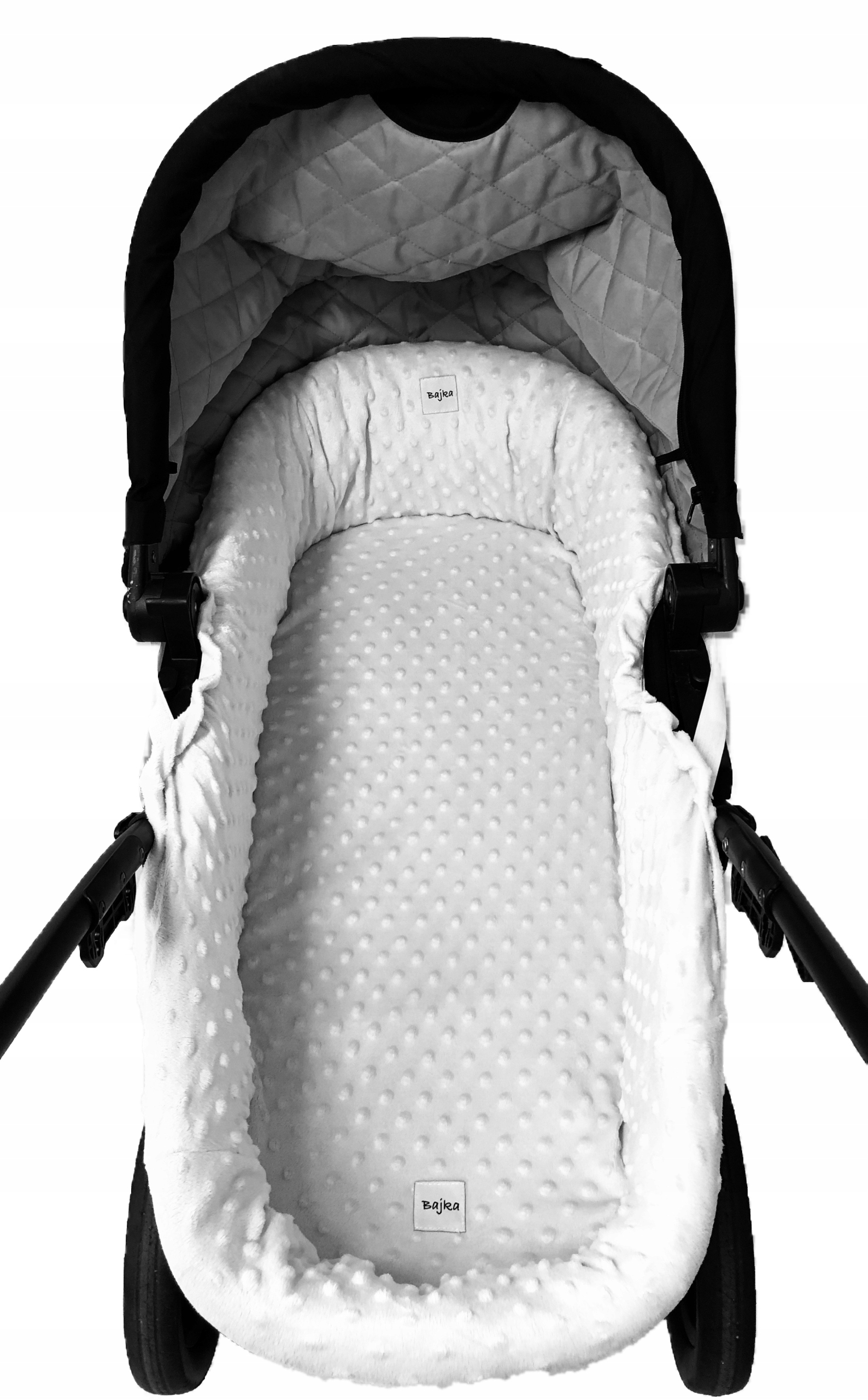 Снаружи протектор имеет вшитую резинку по окружности коляски, что позволяет его красиво разложить по бокам и разместить на дне матраса. Сбоку пришита застежка-липучка, которая облегчает установку при креплении капюшона.