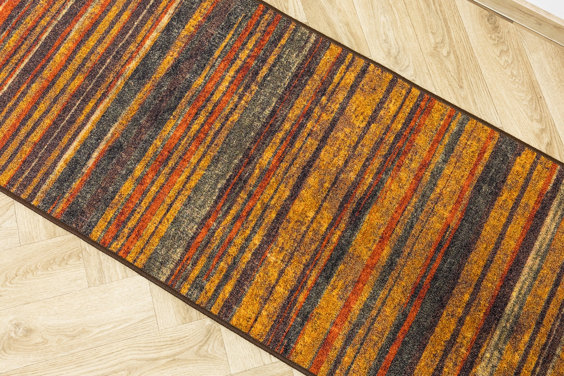 Противоскользящий коврик Fusion из полиамидного флиса с низкой петлей с полосатым рисунком в оттенках серого, оранжевого с кремовыми и желтыми вставками и прорезиненным низом.