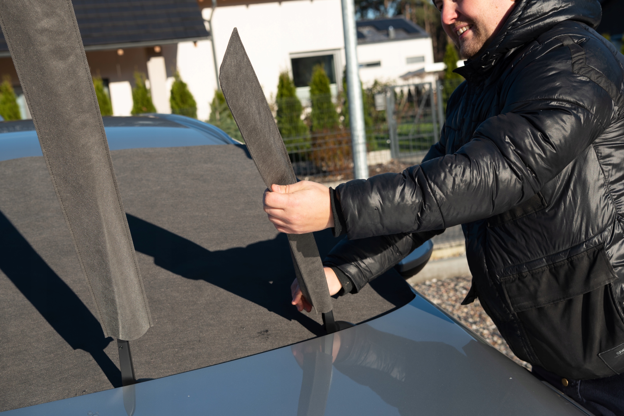 Простота установки: Чехол очень легко устанавливается, он оснащен специальными ручками с флизелиновым покрытием, по которым нужно просто захлопнуть переднюю дверь автомобиля, что также защищает его от угона.