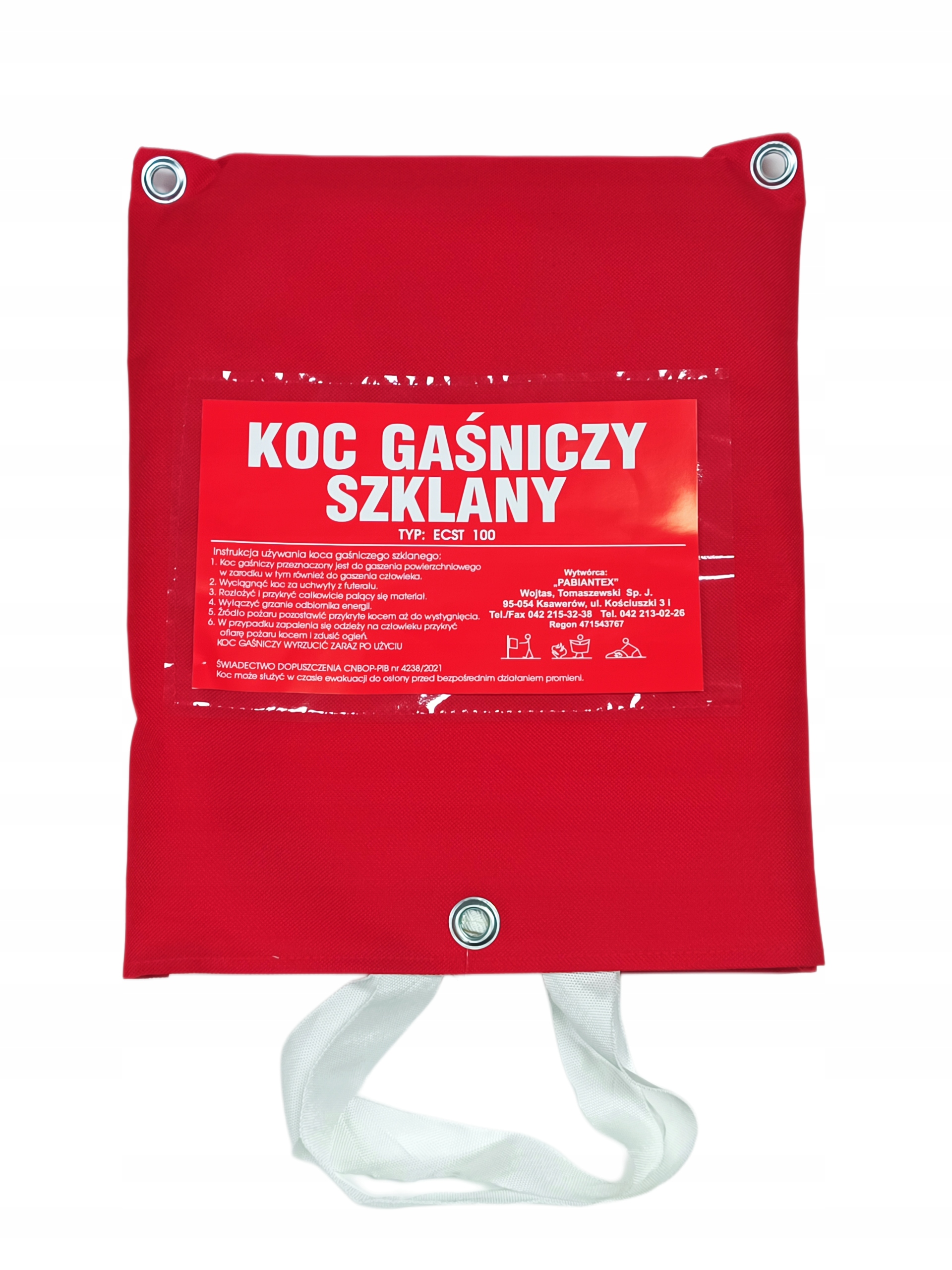 Изготовлен из прочного материала - стекловолокна (ткань ТГ) 560-120). Одеяло готово к креплению на стену. Изготовленный в размере 1200 x 1800 мм, он имеет сертификат одобрения CNBOP 4238/2021.