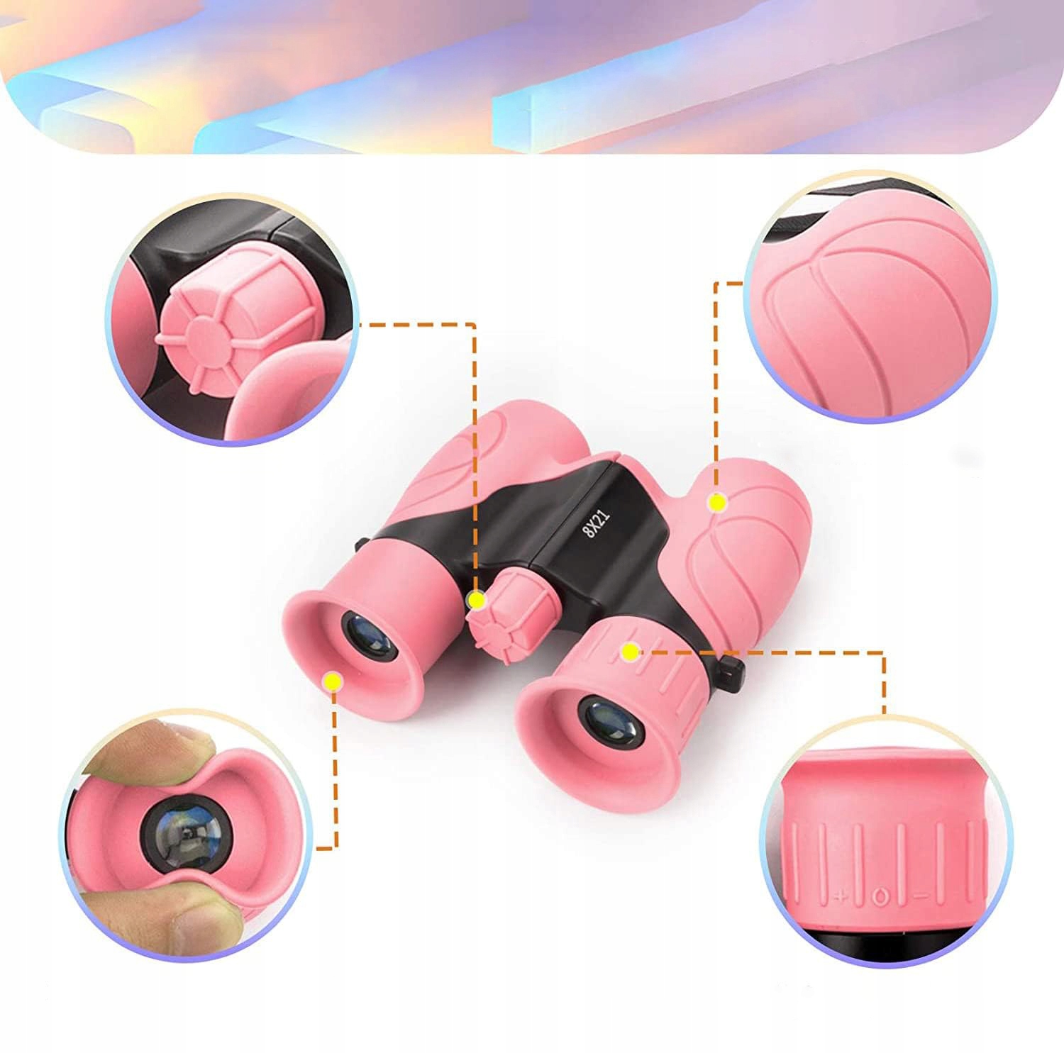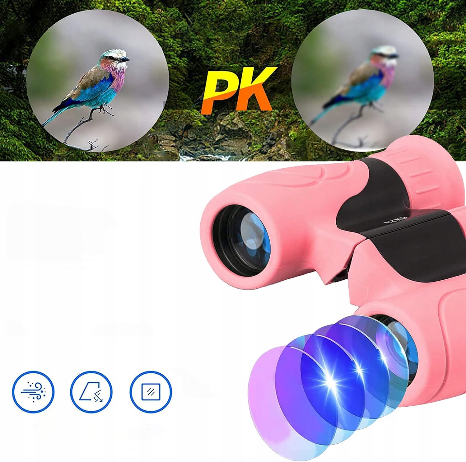 Синее покрытие предотвращает оптические отражения и, следовательно, обеспечивает четкое и красочное изображение. Полное поле зрения с углом обзора, многослойное широкополосное усиление обеспечивает более реалистичное изображение. 8-кратное увеличение и фантастическая видимость. Бинокль можно легко настроить под расстояние глаз каждого ребенка. Идеально подходит для наблюдения за птицами, обучения, охоты, посещения театра, морских прогулок, пеших прогулок, путешествий и наслаждения дикой природой.