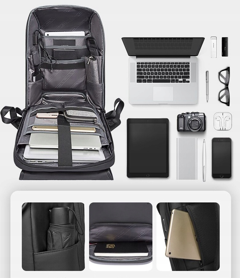 Рюкзак для ноутбука Bange с защитой от кражи 15 ,6" BG-7276 с USB изготовлен из прочного материала, который благодаря пропитке дополнительно водонепроницаем. Рюкзак оснащен противоугонной системой. > - основное отделение можно дополнительно закрепить от открытия с помощью навесной замок с трехзначной комбинацией. В основном отделении имеется специальный мягкий карман для переноски ноутбука, который фиксируется b>резинкой. >множество кармашков поменьше и соединение для павербанка с внешним USB-гнездом над клапаном отделения, закрывающимся на магнит, в котором находится небольшой кармашек По бокам рюкзака имеются два кармана, еще один карман – на молнии – расположен в нижней части рюкзака. И лямки, и спинка обшиты толстыми губками для увеличения. комфорт во время ношения. На одной из лямок есть крючок, например, для очков, а на другой - маленький кармашек. Сзади, под лямками, расположен незаметный карман на молнии и ремень, позволяющий прикрепить рюкзак к ручке дорожной сумки.