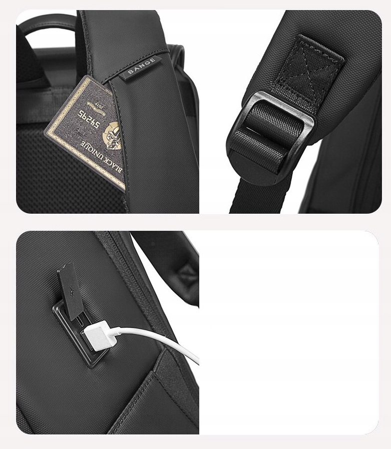 Рюкзак для ноутбука Bange с защитой от кражи 15,6" BG-7276 с USB изготовлен из прочного материала, который благодаря пропитке также является водонепроницаемым. Рюкзак оснащен противокражной системой - основное отделение может быть дополнительно защищено от открывания с помощью навесного замка с трехзначной комбинацией. В основном отделении имеется специальный мягкий карман для переноски ноутбука >, который фиксируется резинкой на липучке. Также имеется множество кармашков поменьше и разъем для павербанка с внешним USB-портом >. Над отделением имеется клапан, закрывающийся на магнит, в котором расположен небольшой карман. По бокам рюкзака расположены два кармана. , еще один карман - застегивается на молнию - расположен в нижней части рюкзака. И лямки, и спинка имеют подкладку из толстых губок, повышающих комфорт при ношении. На одной из лямок есть крючок, например для очков, а на другой - кармашек. Сзади, под лямками, расположен незаметный карман на молнии и ремень, позволяющий прикрепить рюкзак к ручке дорожной сумки.