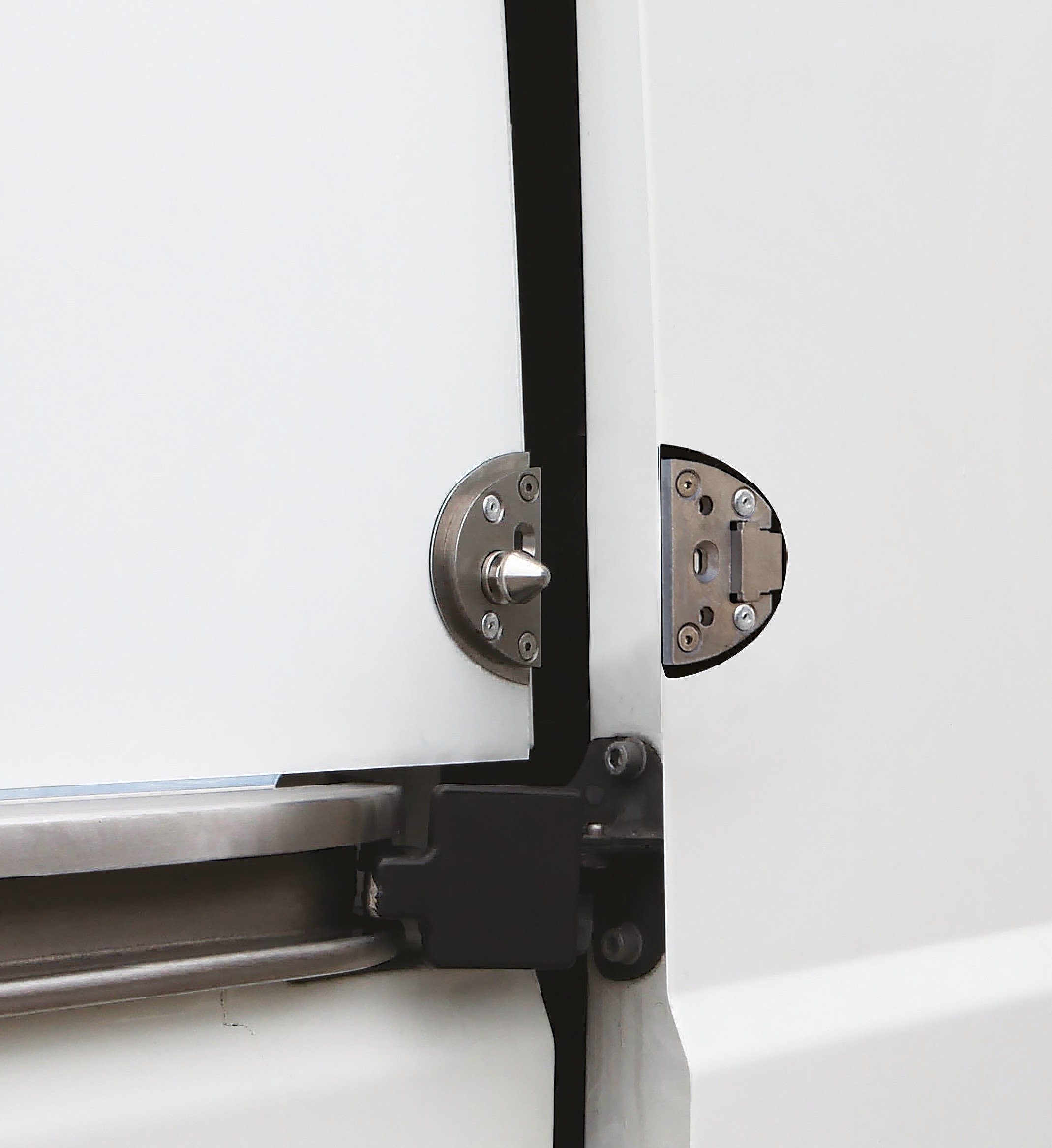 Инновационная система запирания для грузовых автомобилей и автофургонов специальной (запатентованной) формы без острых кромок и точек захвата, изготовленная из коррозионностойкой нержавеющей стали. , может использоваться для задних дверей или боковых раздвижных дверей или для того и другого в парном исполнении с одним и тем же ключом.