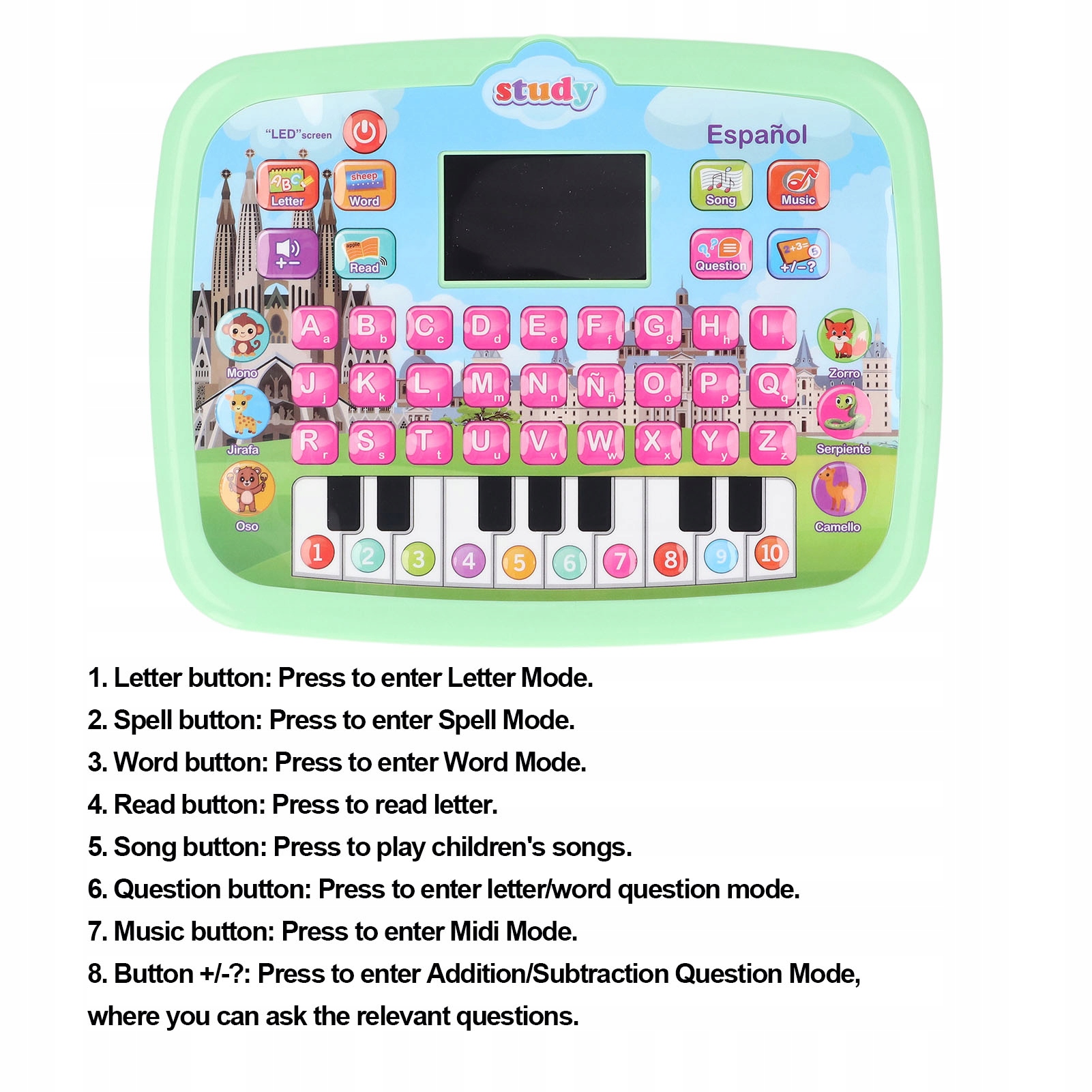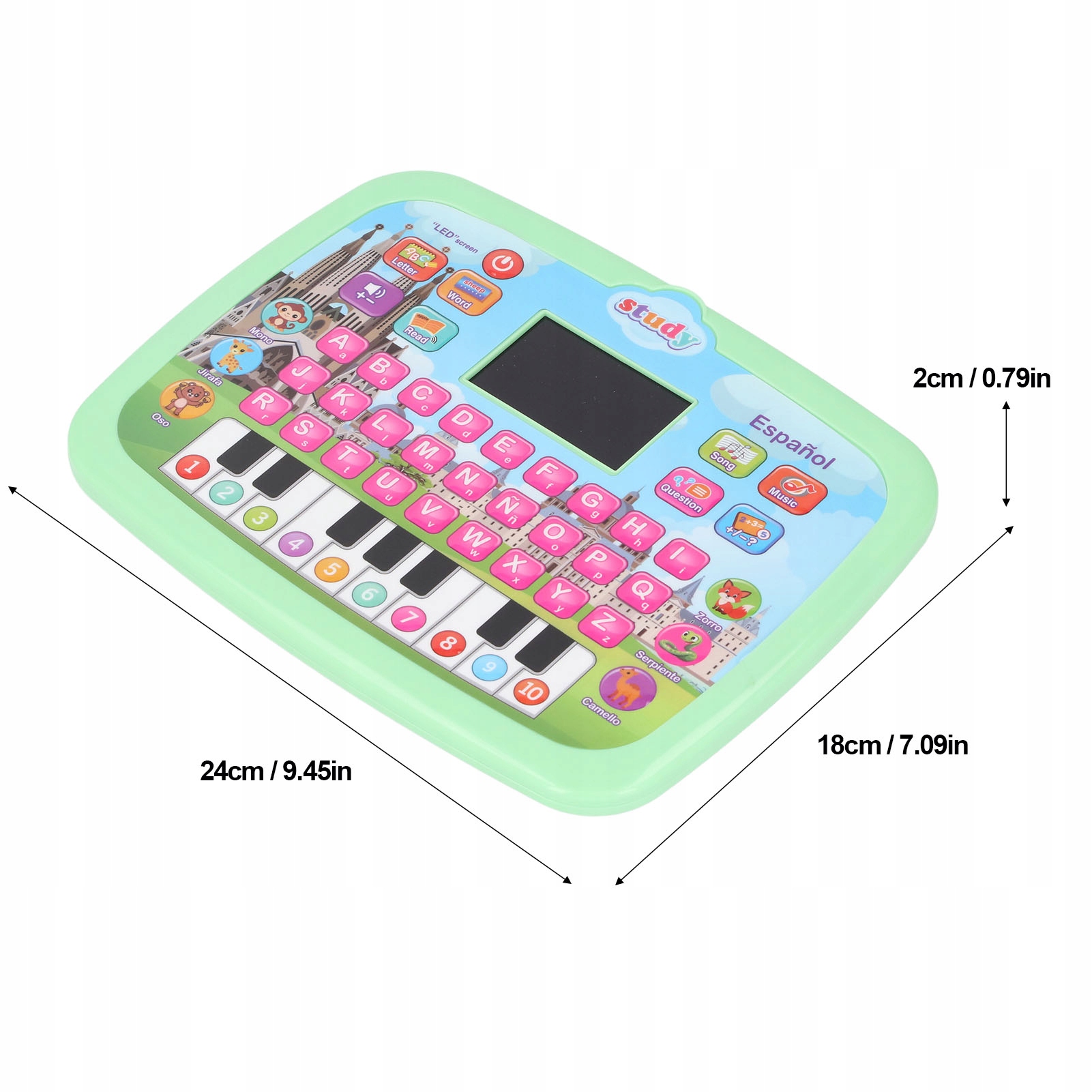 5. Прочный материал: образовательный планшет Led Spanish, изготовленный из безопасного и прочного пластика, прочен и безопасен для детей. Компактный размер 18x24x2 см делает его портативным и удобным для учебы в дороге.
