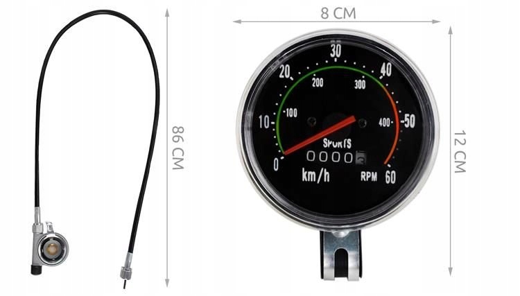 - Простой принцип действия - счетчик управляется кабелем, обычно называемым улиткой, который подключен к переднему узлу сразу за вилкой - амортизатором. Кончик улитки обойден спицами, когда колесо поворачивает передачу улитки, он начинает вращать кабель и запускает механизм. Измеритель показывает скорость до 60 км/ч с революциями и общим количеством перемещенных километров.