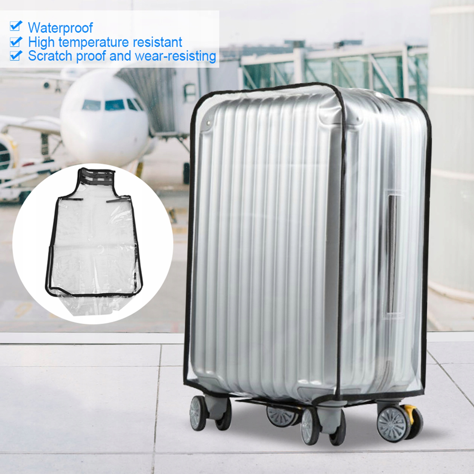 - Чехол чемодана предназначен для защиты его от царапин, пыли и т. д. Изготовлен из высококачественного ПВХ-материала, водонепроницаемый, устойчивый к высоким температурам и износу.
