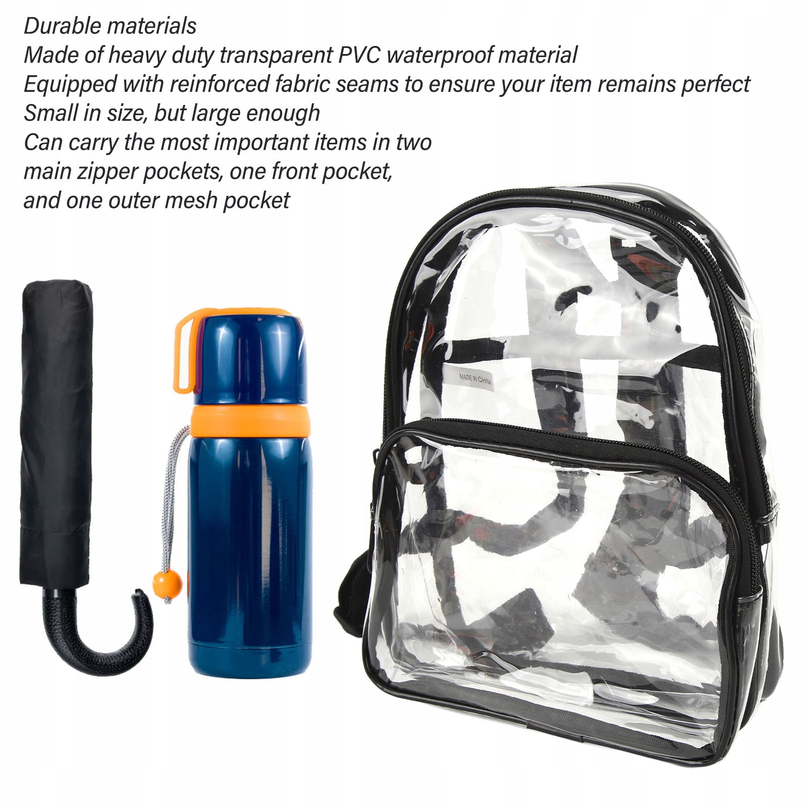 1. Прочный материал: небольшой прозрачный рюкзак изготовлен из прочного прозрачного водонепроницаемого ПВХ-материала с усиленными швами, поэтому ваш предмет останется в идеальном состоянии и может использоваться в течение длительного времени.