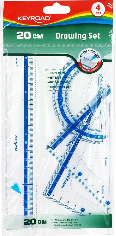 Набор геометрический Keyroad изготовлен из прочного прозрачного пластика. Каждый элемент изготовлен в соответствии со стандартами, гарантирующими их точность и прецизионность в измерениях.