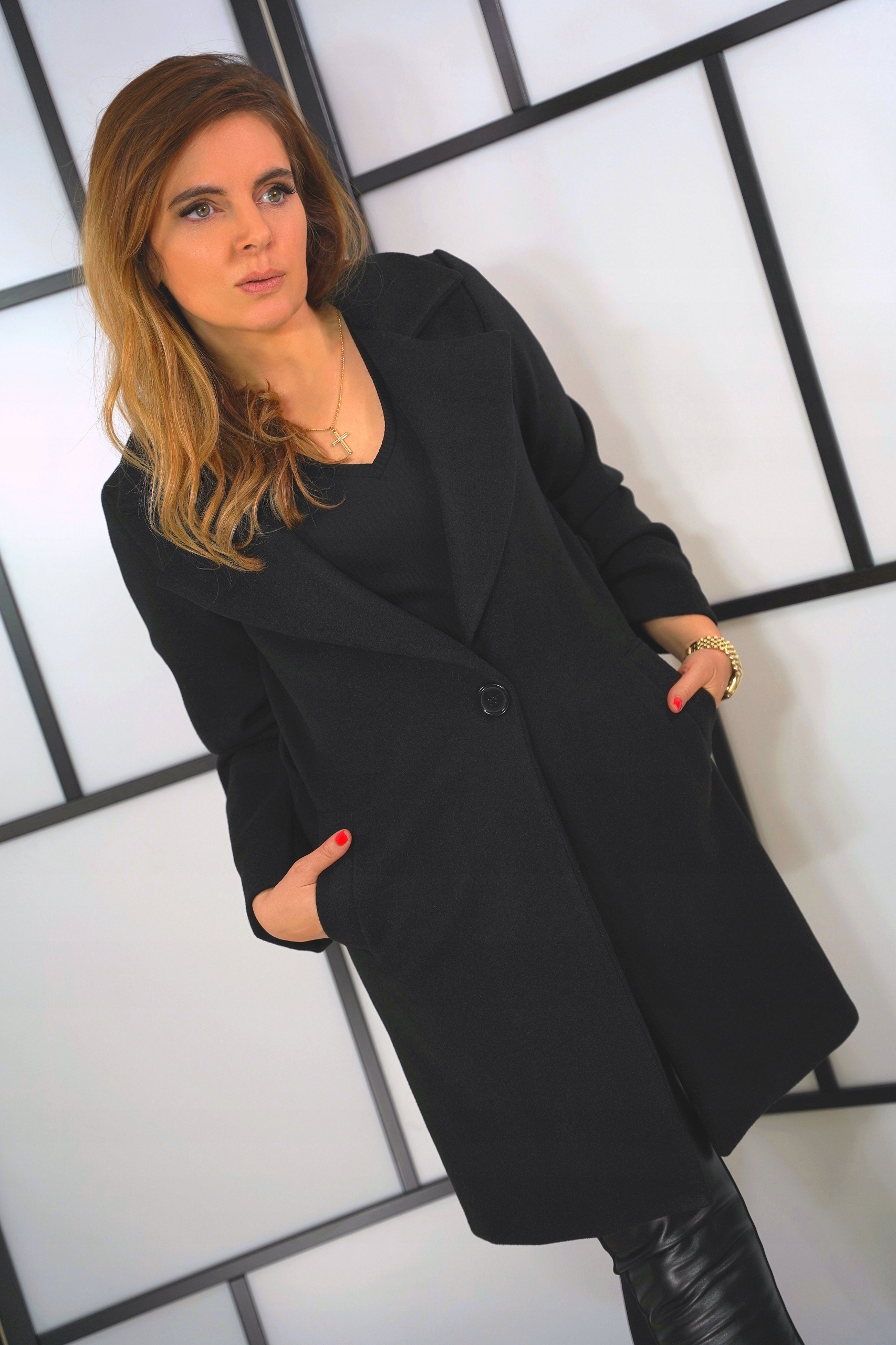Длина пальто достигает непосредственно перед коленом , что заставляет его покрывать недостатки вокруг бедер и успеха.