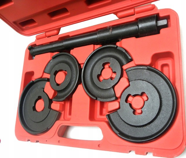 Применение: b> Устройство, используемое для демонтажа и установки пружины между Йокесами подвески (заднее или спереди). Набор оснащен двумя парами взаимозаменяемых дисков с системой безопасности с 3 гакетами. Подтягивание вальта возможно с использованием 6-удачного 19-мм ключа.