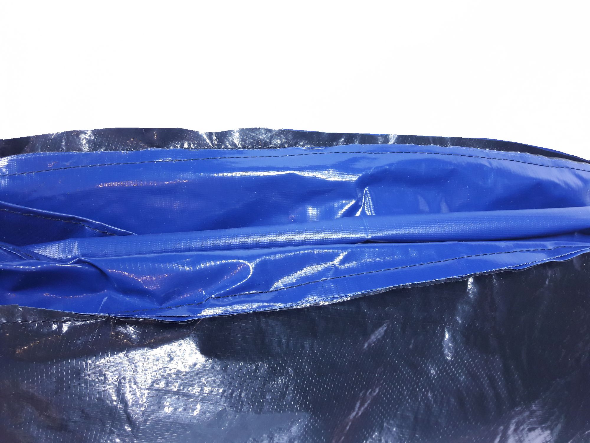 Новая глава в производстве чехлов для батутов: Поливинилхлорид – термопластичные свойства, высокие механическая прочность и устойчивость ко многим растворителям. Чехлы из этого материала можно мыть химическими средствами. Им также не повредит едкий птичий помет, ослабляющий полиэтиленовые покрытия. Чехол устойчив к сложным погодным условиям и солнечному излучению, не трескается. Он эстетичен и хорошо закрывает пружины и другие металлические элементы. Он перекрывает коврик примерно на 5 см. При такой ширине ножка ребенка не будет проваливаться между пружинами. Он мягкий и прекрасно ложится на раму батута. Ширина: 26-27 см и дополнительные 10 см, которые опускаются для покрытия труб каркаса снаружи. Толщина поролона, вшитого в чехол: 12 мм - он жёсткий и не разлетается. Крепится к раме резиновой стяжкой - свободно.