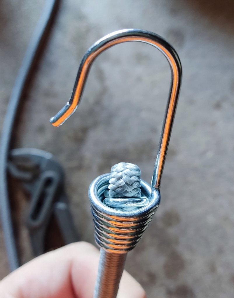 <р>1. Откройте зажим плоскогубцами настолько, чтобы можно было вставить внутрь сложенный вдвое кабель. <р>2. Продеваем резиновый шнур через пружинный крючок и сгибаем его дважды. <р>3. Наденьте зажим на согнутую резину и плотно разомните/зажмите ее (с помощью больших плоскогубцев или трубогубцев) <р>4. Натягиваем резинку так, чтобы согнутая резинка скрылась внутри крючка.