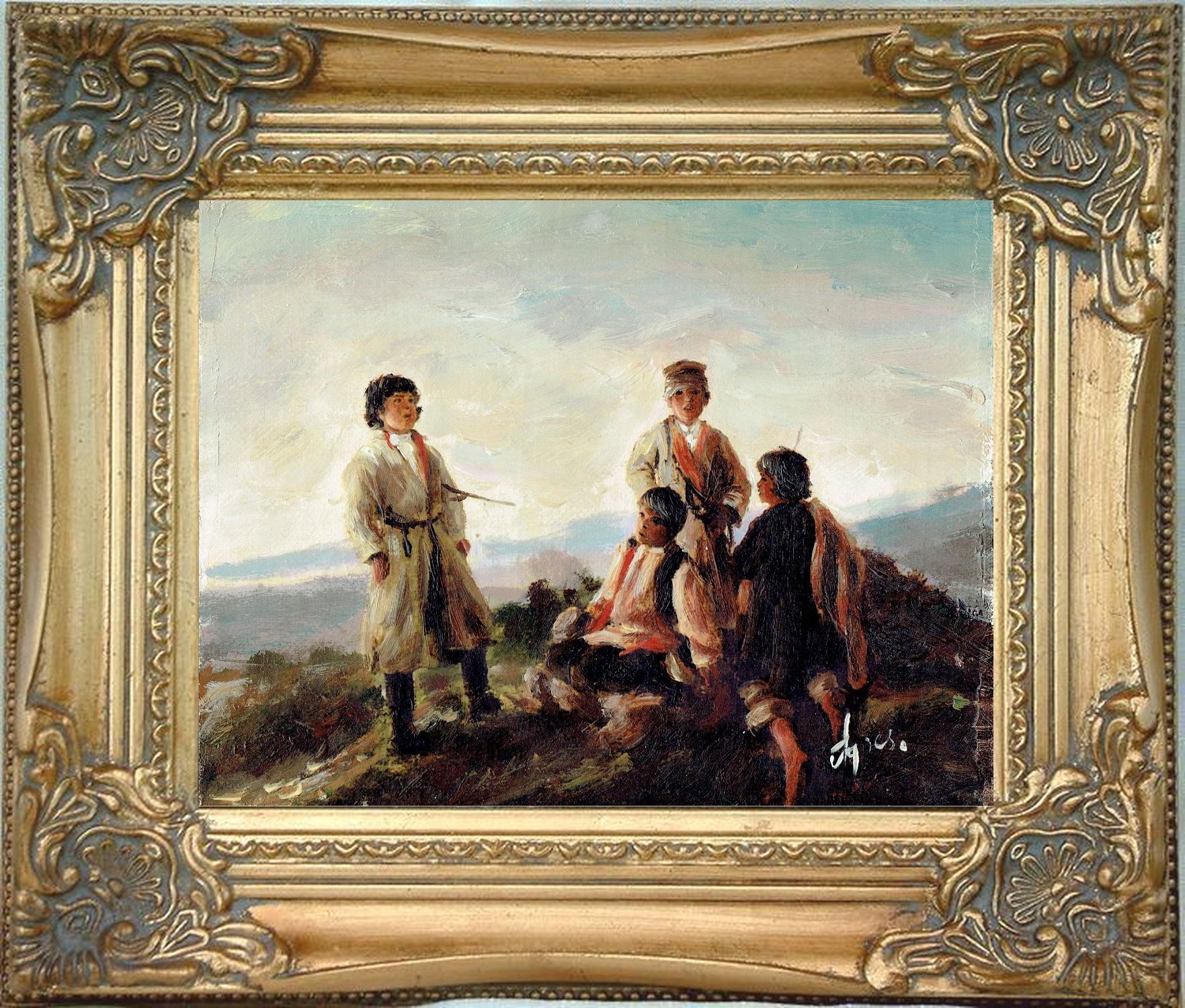 НА КАРТИНЕ ИЗОБРАЖЕНА ГРУППА МАЛЬЧИКИ - ПАСТУШКИ, В МЯГКИХ СИЯНИЯХ ВОСХОДЯЩЕГО СОЛНЦА, НА ФОНЕ ТУМАННОГО ПЕЙЗАЖА, ПОЮТ РЕЛИГИОЗНУЮ ПЕСНЮ, ВСТРЕЧАЮ ИХ НАПРЯЖЕННЫЙ ДЕНЬ.