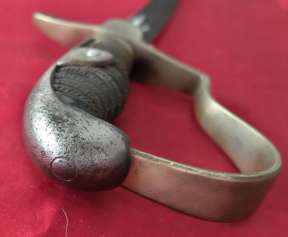 Оправа рукоятки изготовлена из сталь, древко покрыто эбонитом, сохранена оригинальная оплетка. Рукоять не кованная, люфтов нет. Остатки оригинальной красной ткани под перекладиной.