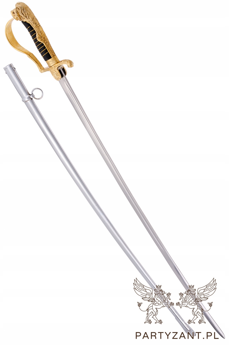 Сабля М1848 Полностью изготовлена из высококачественной кованой стали. Клинок вогнутый с обеих сторон, прорезан в широкую канавку - отполирован. Скоба и головка из латуни. Навершие рукояти с характерной львиной головой, проходящей через гриву к перекладине. Дополнительные украшения дужки и крестовины цветочными мотивами. Рукоять обтянута кожей и украшена проволокой.