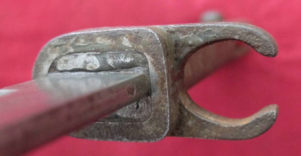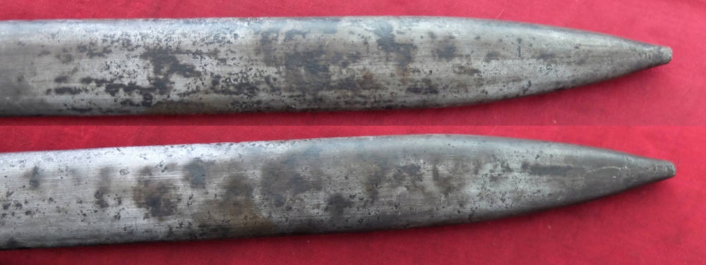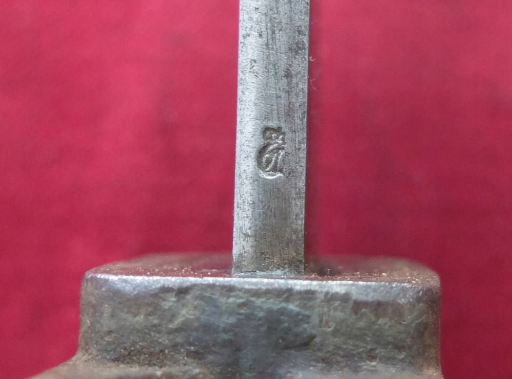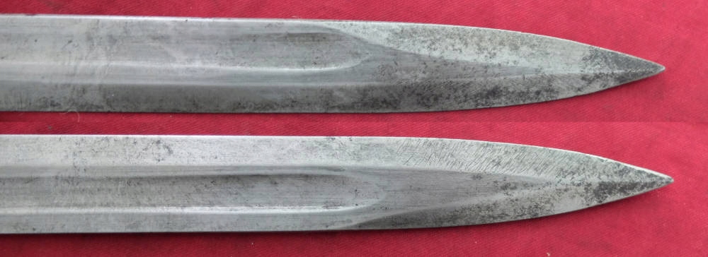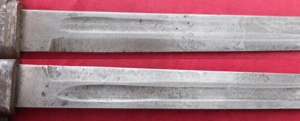 Копия видна на фотографиях. Клинок не заточен и имеет следы заточки того времени. На тыльной стороне клинка имеется прусский штамп. Байонетный замок рабочий. На рукояти видны остатки оригинальной краски.