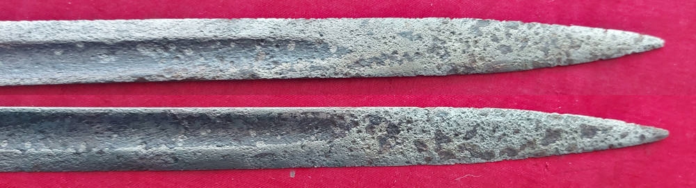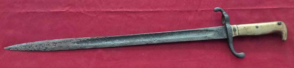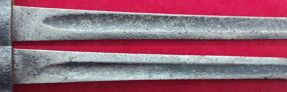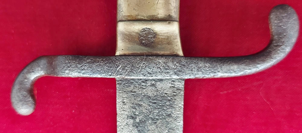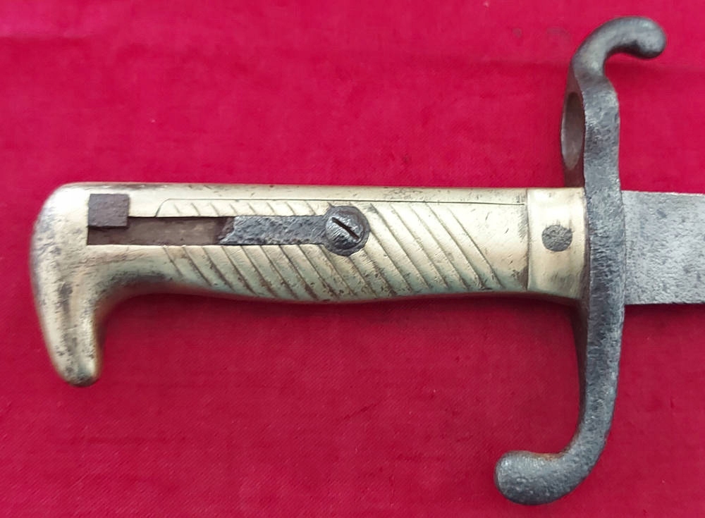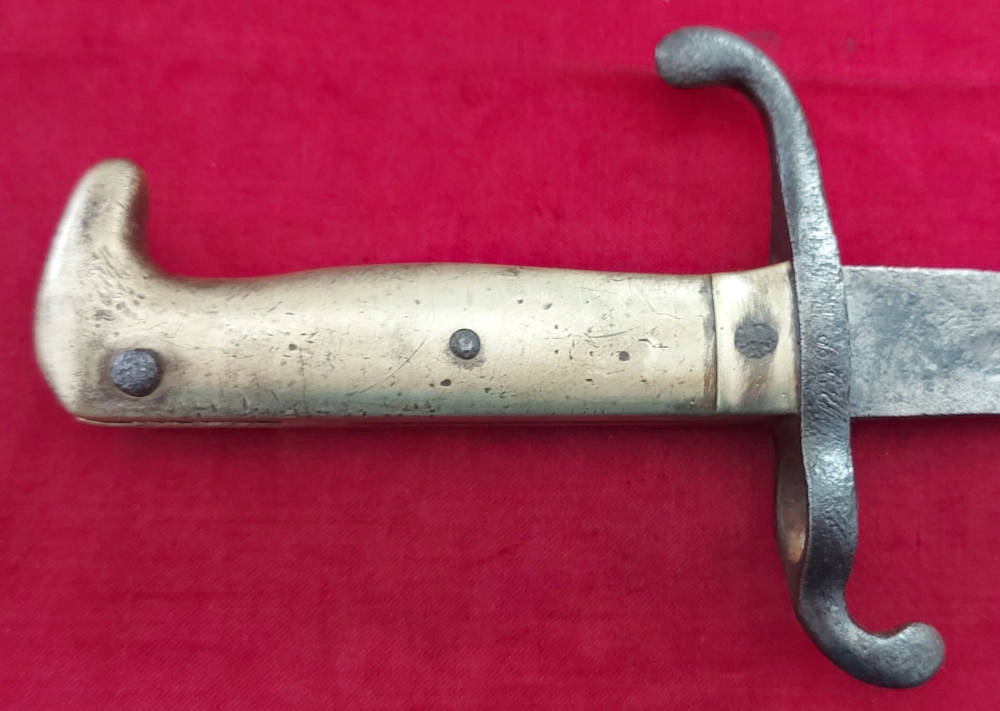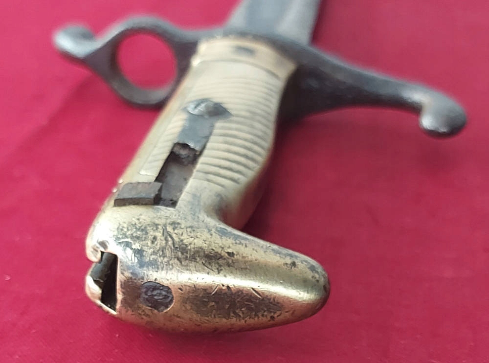 Товар виден на фотографиях. Клинок незаточенный, покрыт ямками, механически устойчив. Ручка латунная. Пружина замка повреждена, защелка подвижна. Неразборчивые полковые знаки на перекладине. Маркировка на тыльной стороне клинка едва видна.