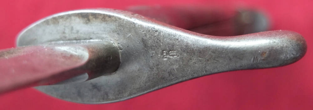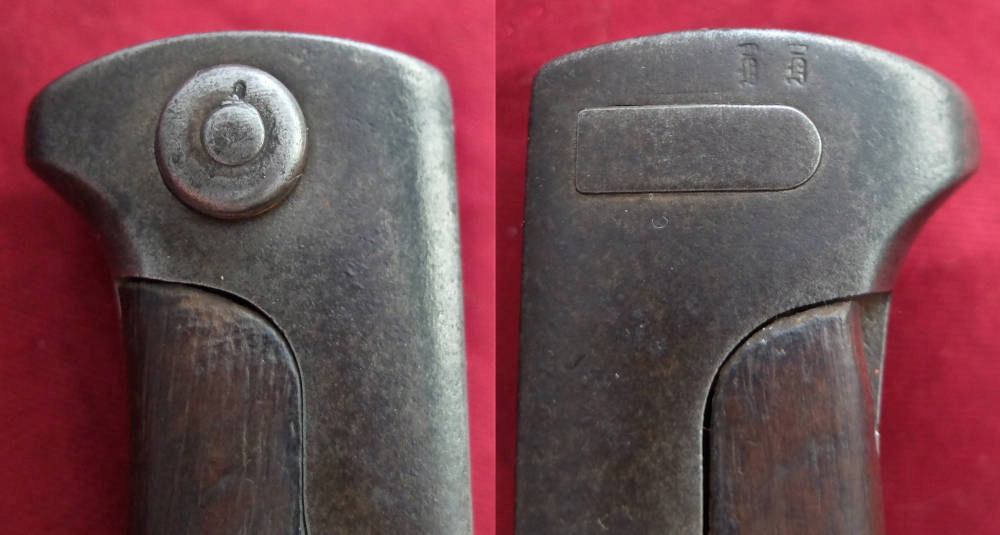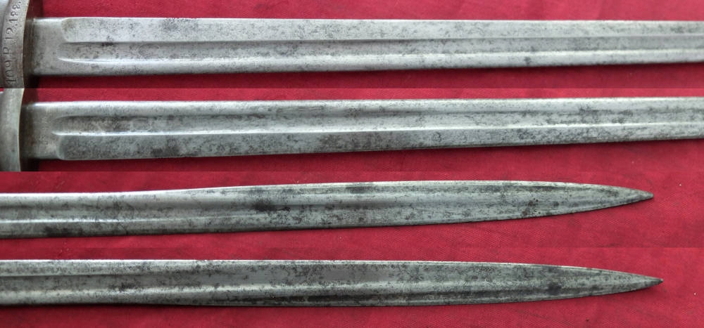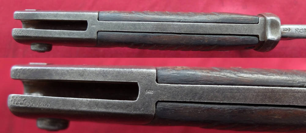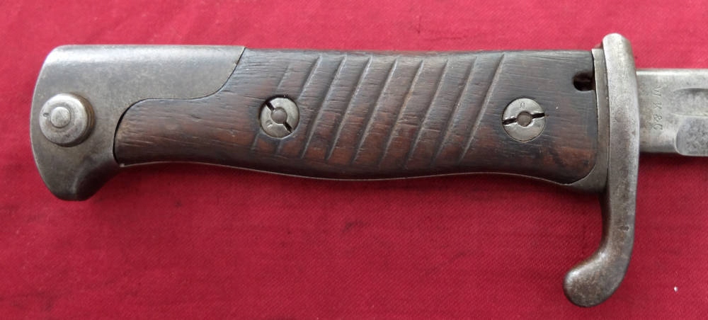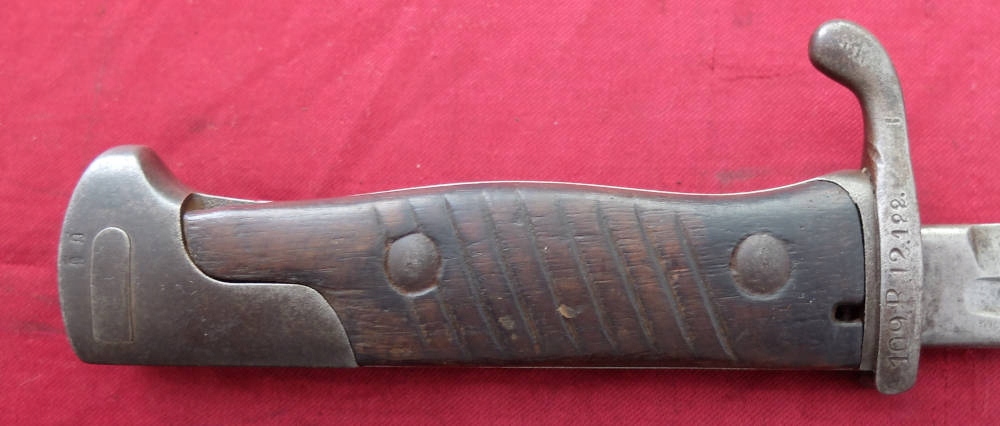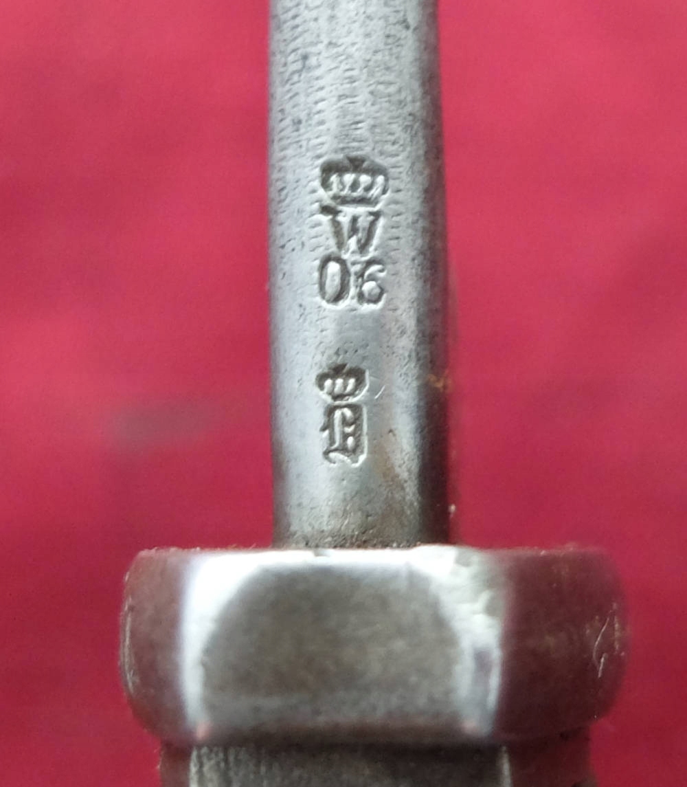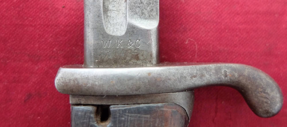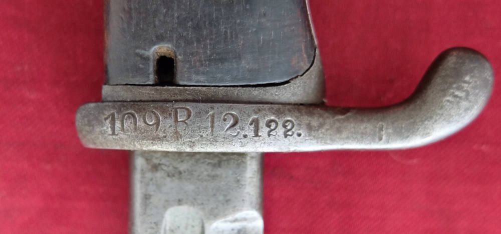 На пороге клинка маркировка производителя W.K.&C. Золинген. На тыльной стороне клинка прусские острия, год поступления 1906. Накладки рукояти оригинальные, деревянные. Байонетный замок рабочий. На головке, цевье и винтах облицовки выштампованы прусские точки. На цевье видны полковые знаки 109.Б.12.122.