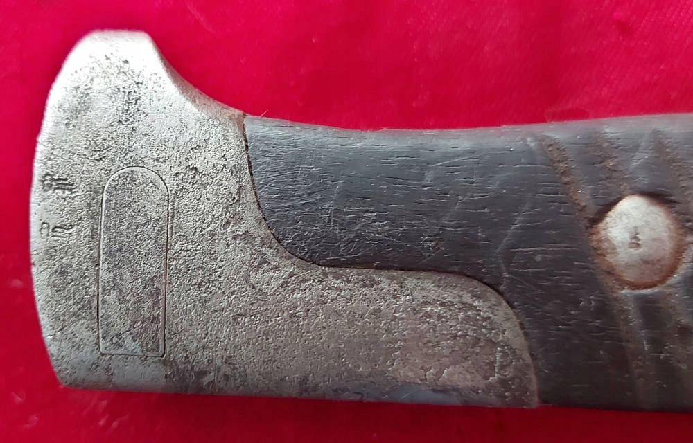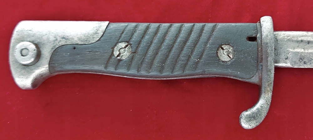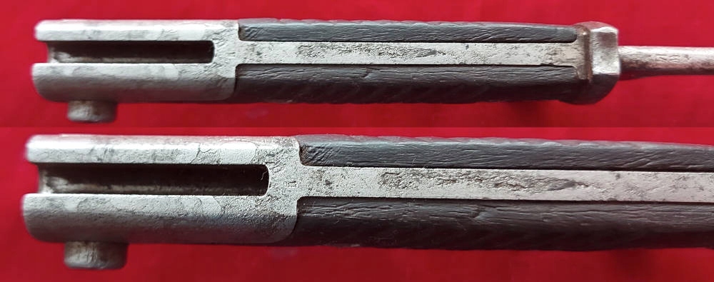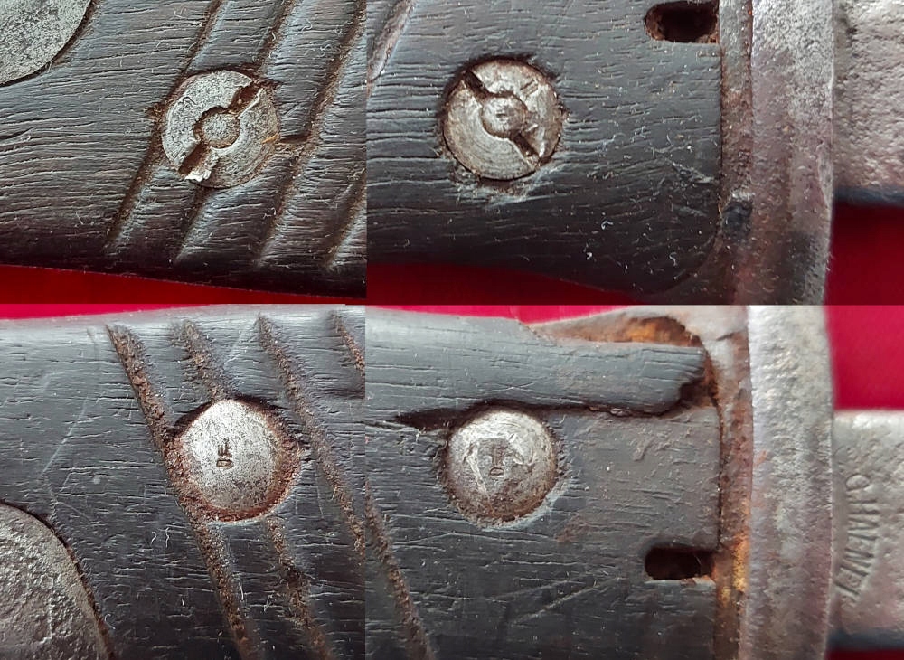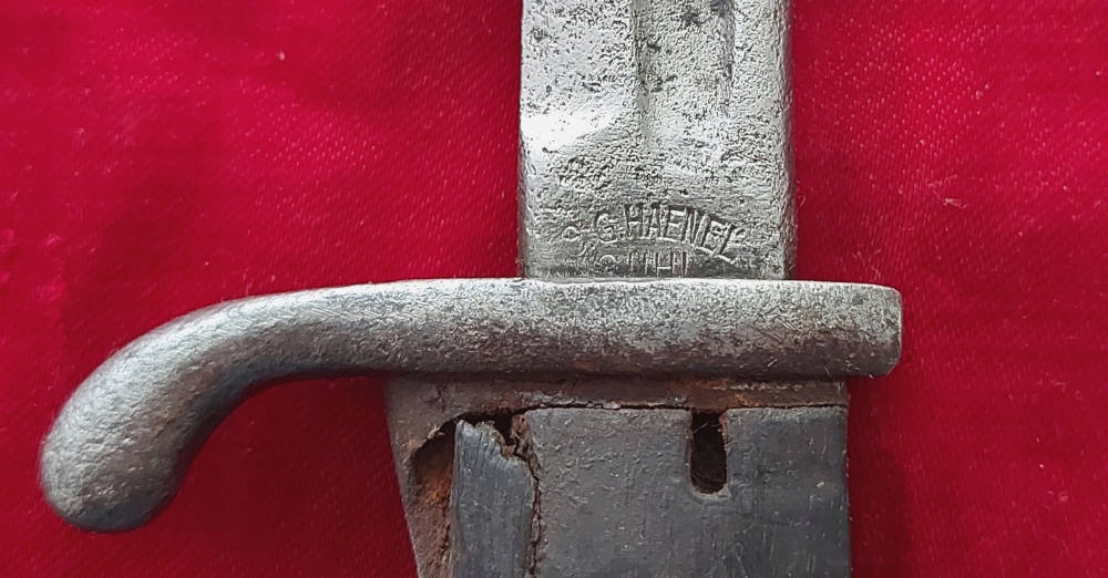 На кромке лезвия находится подпись производителя C.G.HAENEL SUHL. На тыльной стороне клинка размытые военные квитанции, год поступления 1914. Накладки на ручки деревянные и оригинальные. Байонетный замок рабочий. На навершии и крестовине выштампованы прусские награды.