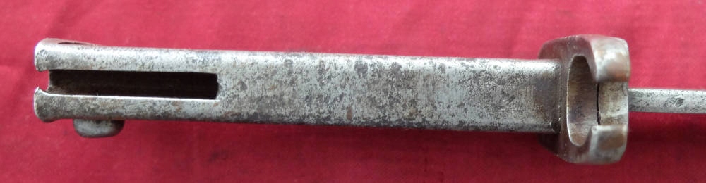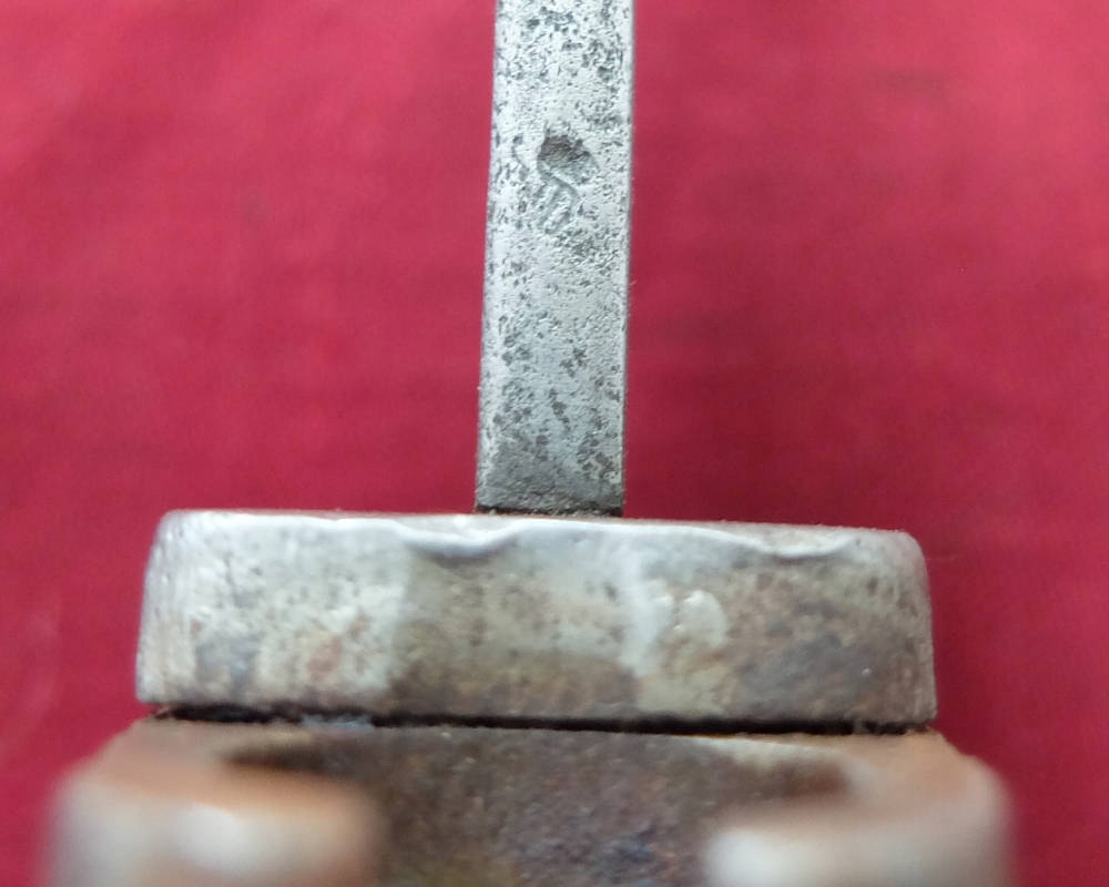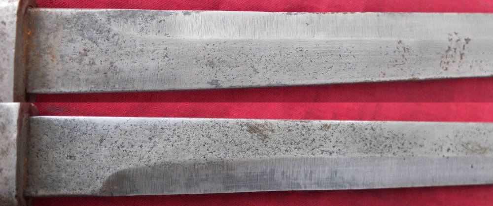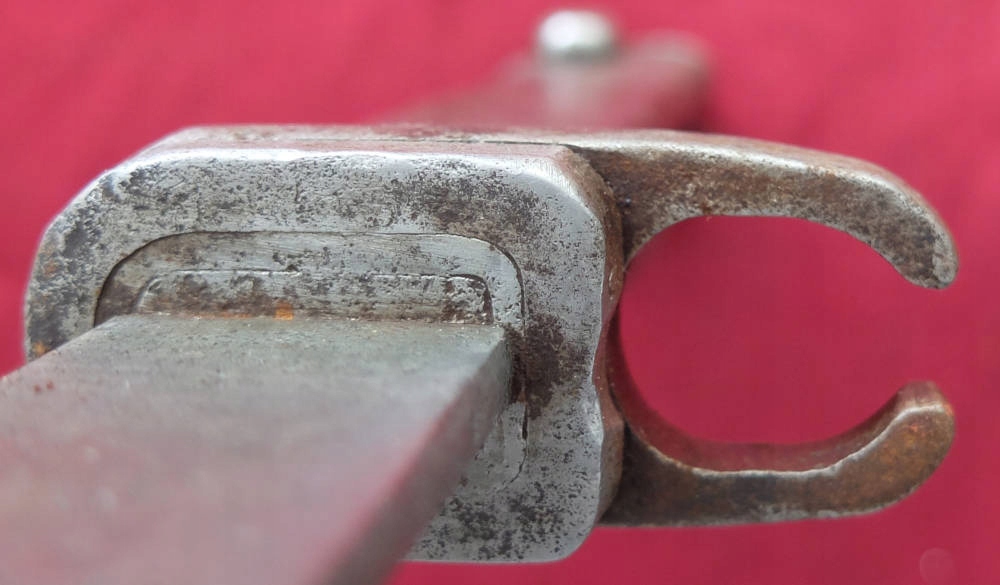 Экземпляр виден на фотографиях, хорошо сохранился. Он сделан полностью из металла. Лезвие заточено, имеет небольшие выемки. Прусский удар по клинку. Байонетный замок подвижный, но не на весь свой размер.
