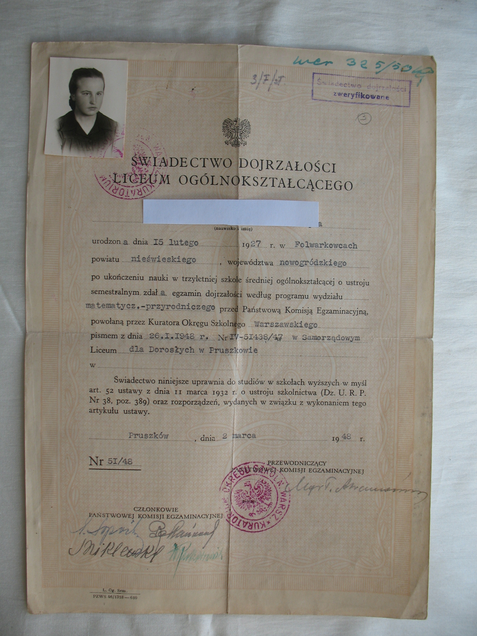 PRUSZKÓW ŚWIADECTWO DOJRZAŁOŚCI LICEUM OGÓLNOKSZTAŁCĄCEGO MATURA 1948