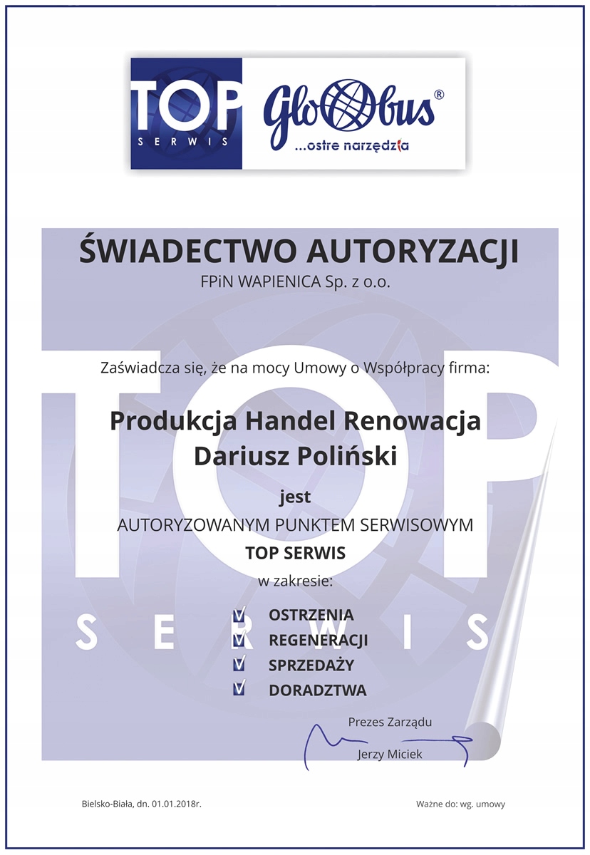 Возможно профессиональное обслуживание и восстановление продаваемого нами инструмента. Это подтверждено сертификатом TOP SERWIS.