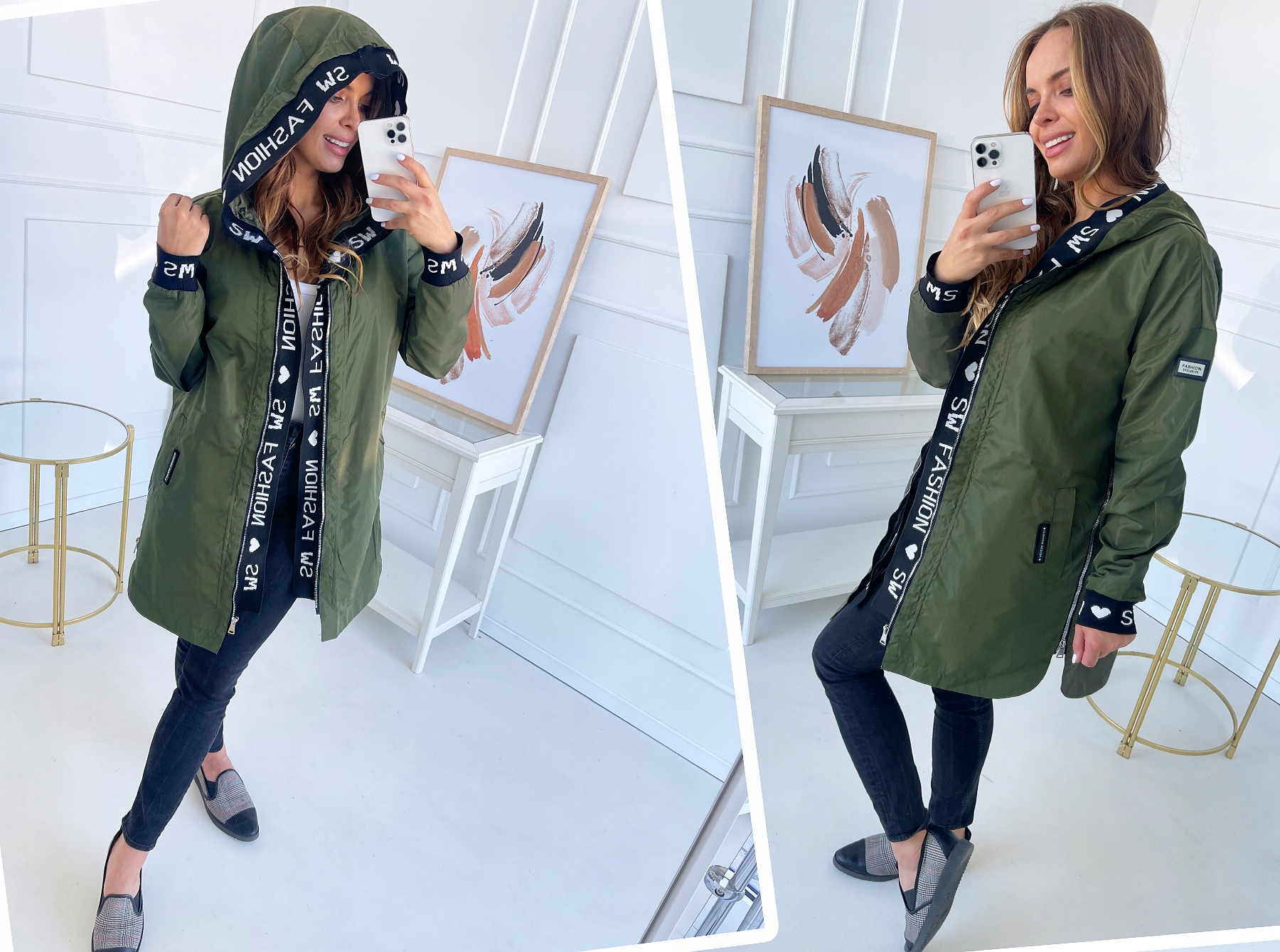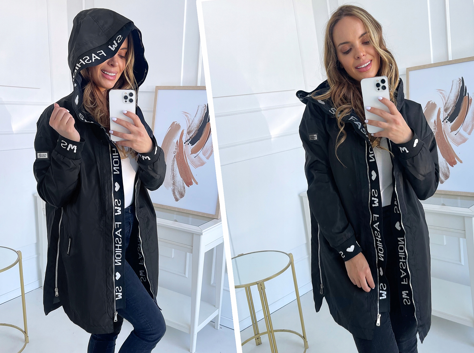 - Самая модная трикотажная отделка по молнии, капюшону и рукавам.