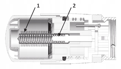 Датчик жидкости «1» при повышении температуры в помещении через предохранитель «2» воздействует через специальный штифт на тарелку термостатического клапана, вызывая уменьшение потока теплоносителя через радиатор и, как следствие,