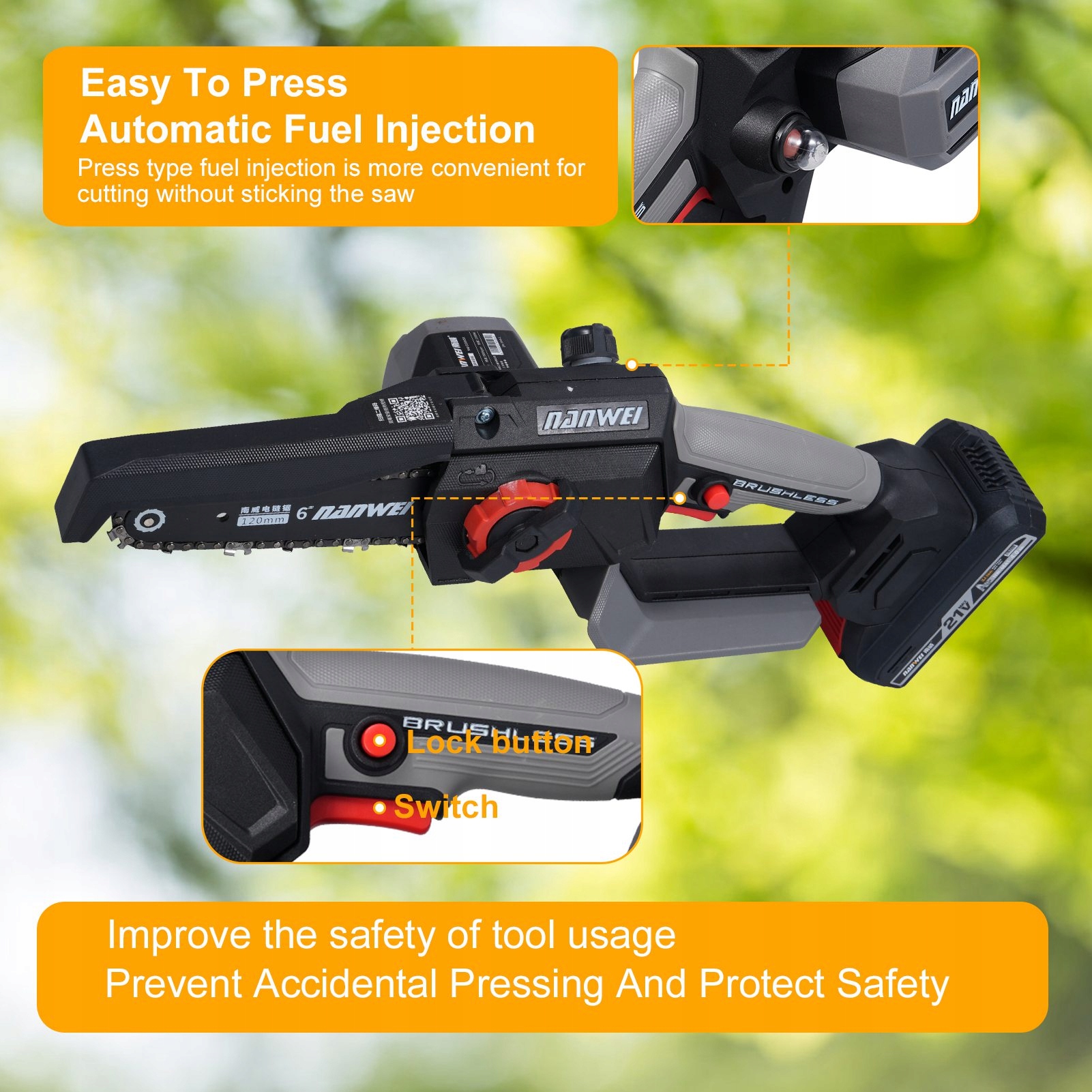 1. Бесстраночная технология двигателя: оснащена бесщеточным двигателем для более длительного срока службы и более высокой эффективности. Это снижает затраты на техническое обслуживание и обеспечивает постоянную производительность во времени, что делает его идеальным для частого использования при регистрации, разрезании деревьев и техническом обслуживании сада.