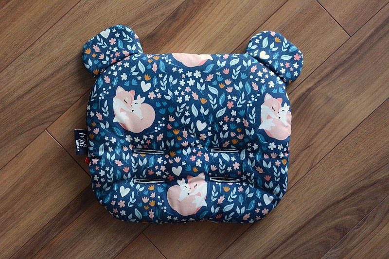 Подушка не скатывается за спину ребенка. Имеет два ряда отверстий для подтяжек. Незаменим, если вздремнуть во время прогулки. Его также можно разместить в шезлонгах или креслах.