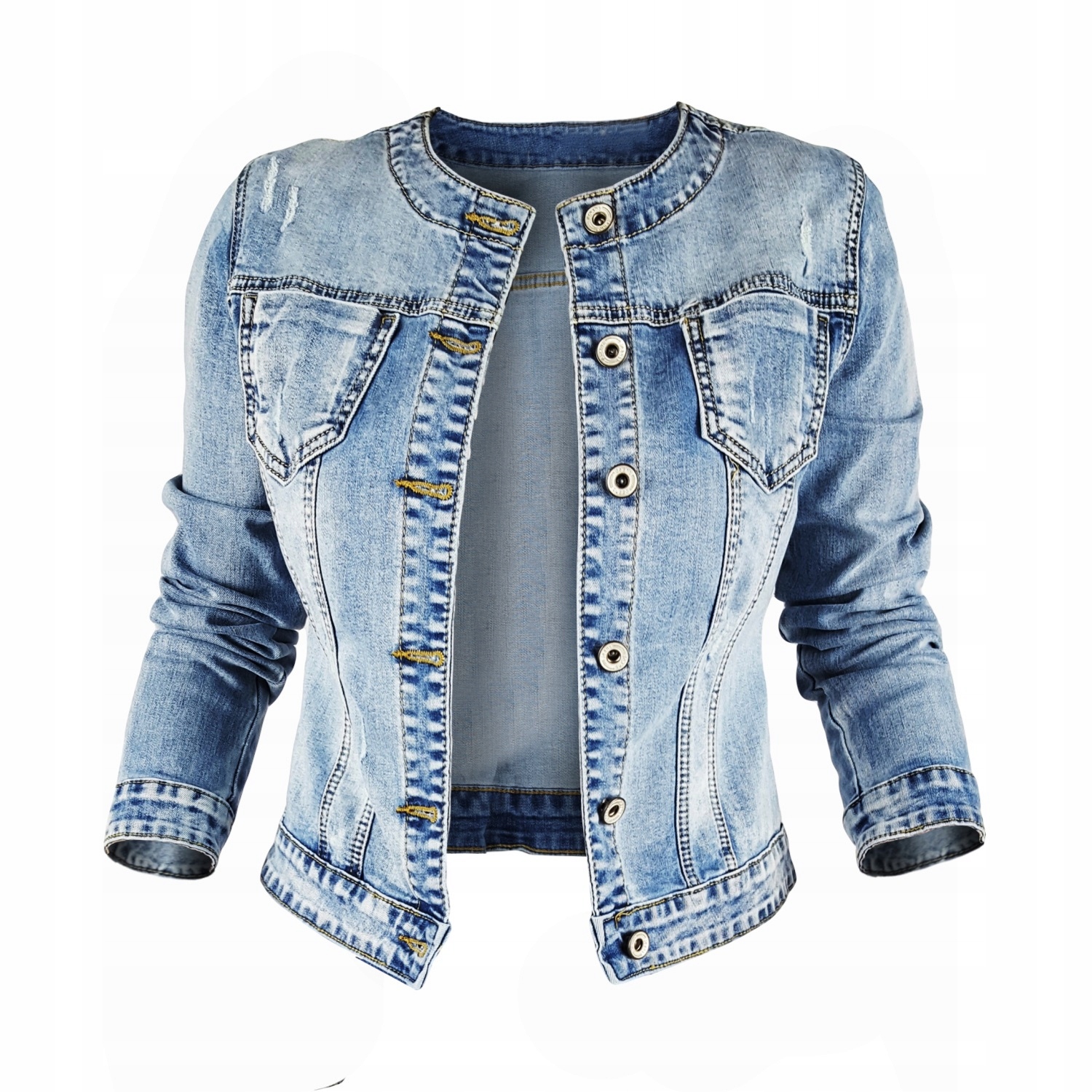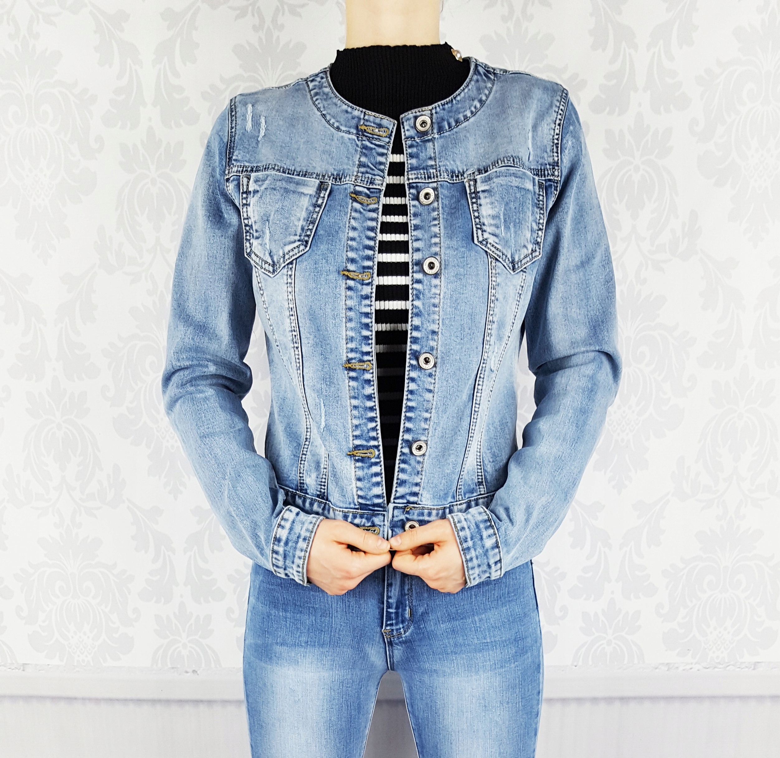 Отличная джинсовая куртка с модными потертостями, застегивающаяся на металлические пуговицы. Его можно использовать в любом стиле, как с классическими джинсами и белой футболкой для повседневных выходов, так и с женскими платьями, придав им роковый характер. Он обязательно должен быть в каждом гардеробе.