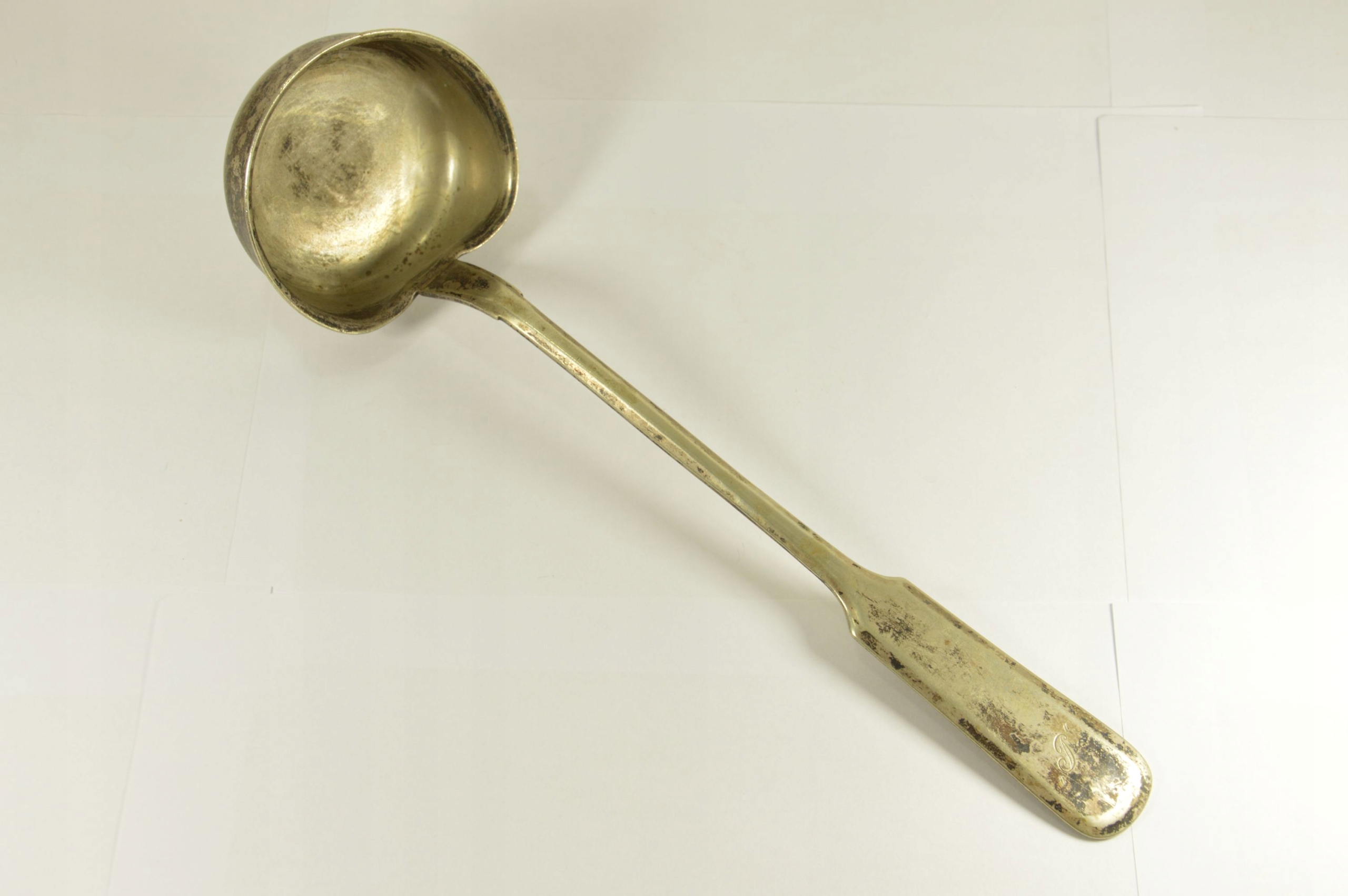 Оригинальная довоенная ложка/половник Schiffers Warszawa. Изготовлен из белого металла, посеребренного цвета, с монограммой на ручке. Ковш со старой вмятиной на ручке - нужно править в горячем виде.