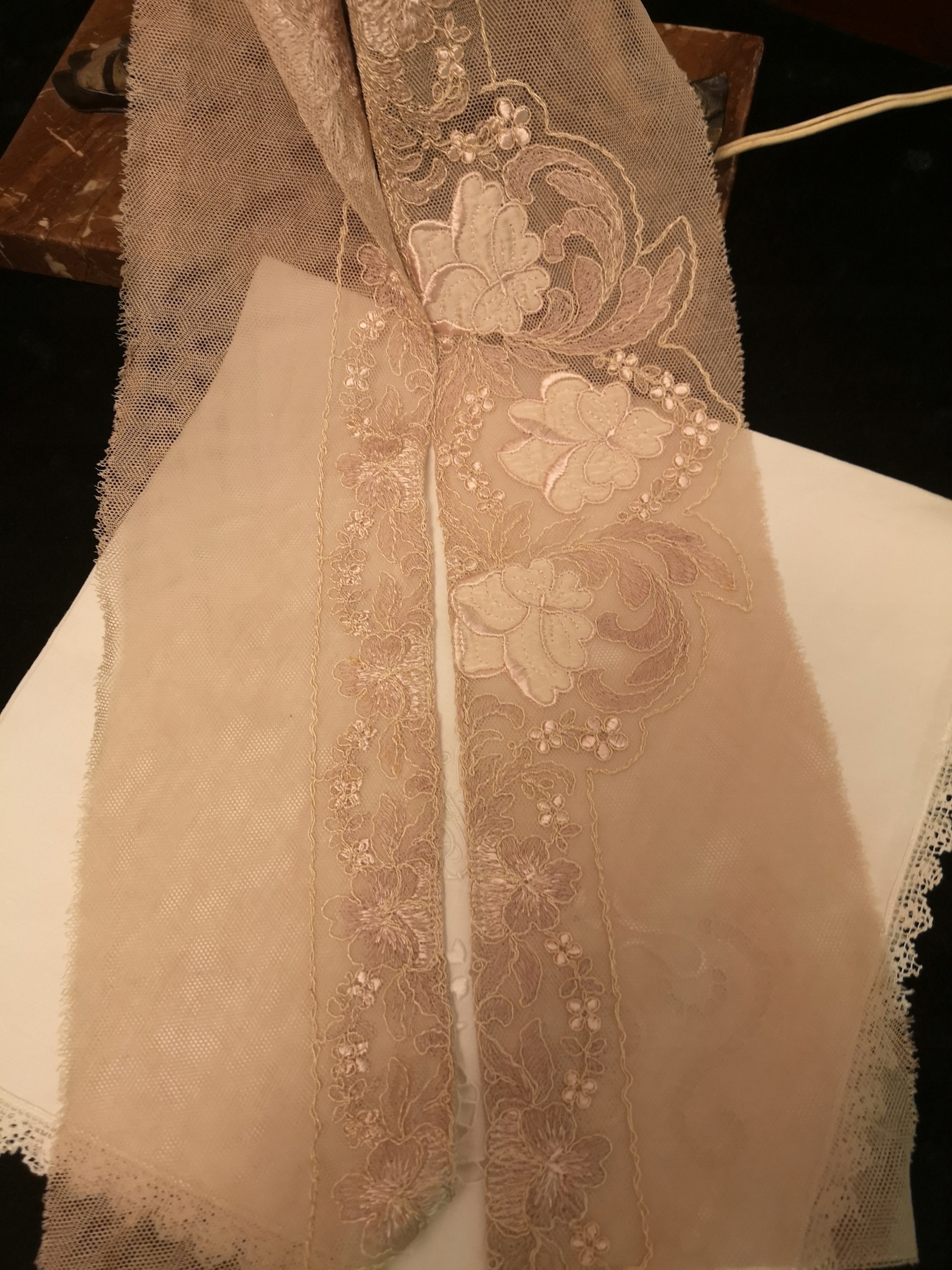 Тюлевая вставка для нижней юбки оттенка, похожего на тот, что на фотографиях, межвоенного периода, вероятно, из Кале. В центре красивые аппликации из шелкового атласа. Ткань была обновлена, все еще прочная, неиспользованная и в хорошем состоянии. Произношение итого: 95 см х 10 см; ширина самой вышивки от 3,5 см до 10 см. Приглашаю вас принять участие в торгах и на других моих аукционах.