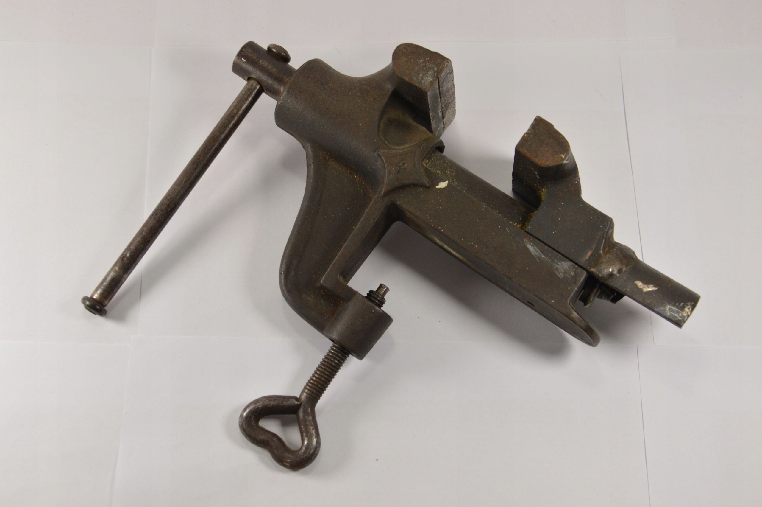 Интересные, старые тиски с номером 4. Тиски рабочие, видны старые повреждения - треснутый корпус и сварной шов. Несмотря на повреждения, тиски работают исправно и полностью работоспособны.
