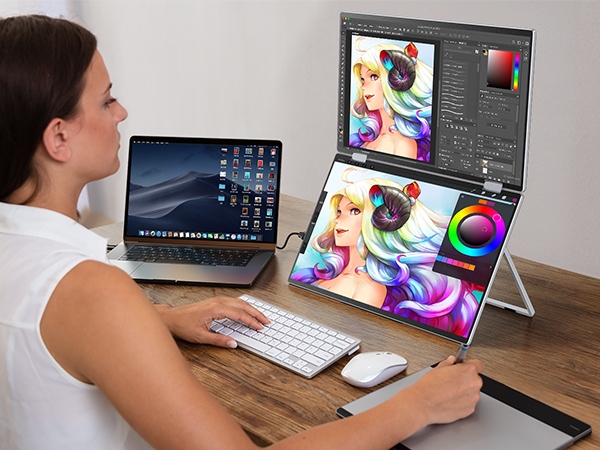 Мы очень рады представить наш новый гаджет Δ! В мониторе с двойным стеком используются два складных экрана, что идеально подходит для расширения рабочего пространства ноутбуков и компьютеров, а также удобно для настройки рабочей станции и регулировки рабочего окна, обеспечивая более эффективную и разнообразную обработку на рабочем месте. Складной монитор Δ можно отрегулировать под регулируемым углом, что позволяет пользователям просматривать экран с лучшим обзором и снижает усталость шеи.